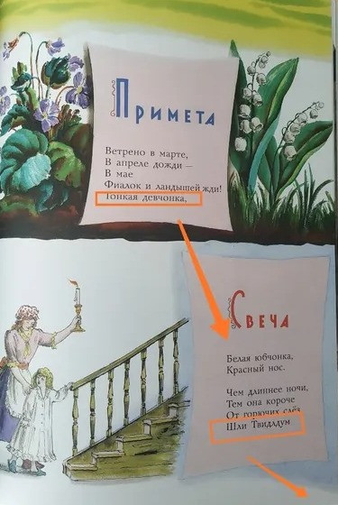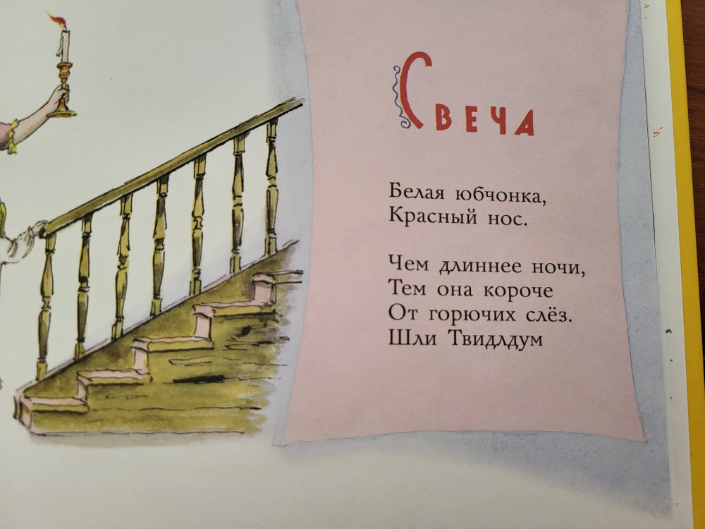 Сама книга просто офигенна! Шикарнейшее издание! Бумага плотная, ничего не просвечивает, иллюстрации великолепные, четкие. Книга большая и тонкая. Обложка матовая, очень приятная на ощупь. Хотя из-за того, что она матовая, пришла запачканной немного в нижнем углу, но это можно было оттереть. Но, мне пришлось ее вернуть и это вина издательства. В шести стихах последняя строчка из следующего стиха почему-то напечатана в предыдущем. На фото видно. Хорошо, я эту книгу села дома читать и только так заметила. Лучше проверять в пункте выдачи. Теперь научена вот таким опытом... Но кто же знал, что такое вообще бывает..! Видимо, партия такая пришла с ошибками, без понятия... Но так обидно, т.к. книжка просто идеальная. В пункте попросила отметить, что это брак. Отметили. Я ее все равно закажу еще, но позже. Надеюсь, пришлют партию без ошибок. А так Flip-у спасибо за доставку и понимание!!