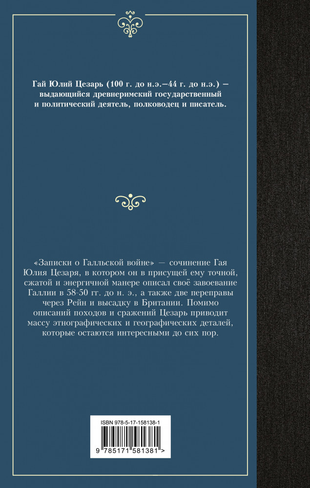 💳 Оплатить за товар можно при получении 🇰🇿 Есть бесплатная доставка по Казахстану от 1 дня 🎁 Копите бонусы с каждой покупки Серия: Лучшая мировая классика «Записки о Галльской войне» — сочинение Гая Юлия Цезаря, в восьми книгах которого он в присущей ему точной, сжатой и энергичной манере описал своё завоевание Галлии в 58-50 гг. до н. э., а также две переправы через Рейн и высадку в Британии. Помимо описаний походов и сражений Цезарь приводит массу этнографических и географических деталей, которые остаются интересными до сих пор. |