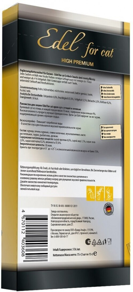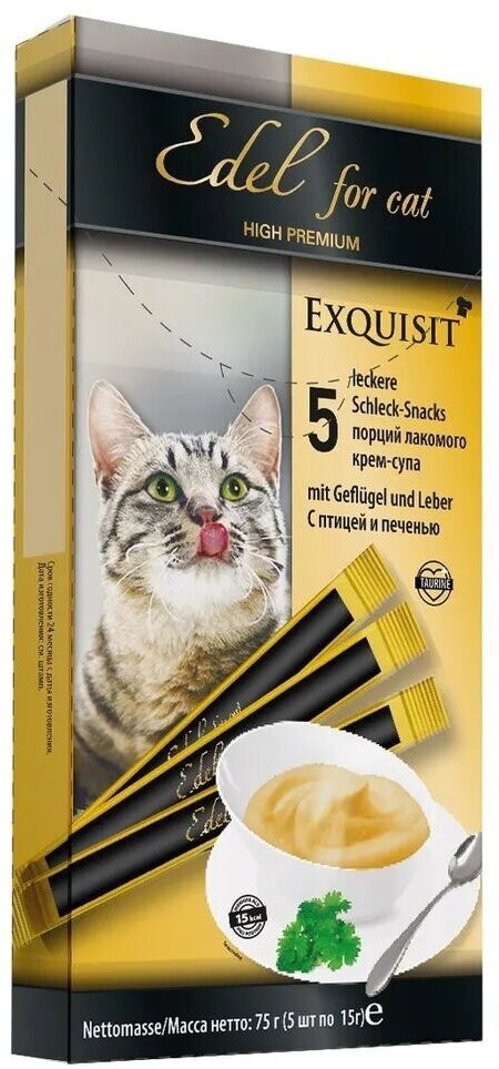 Edel Cat Лакомство для кошек «Крем-суп с птицей и печенью»В данный момент этот товар отсутствует в продаже. Возможно, у нас найдется аналогичный или похожий товар здесь. Условия хранения товара: температурный режим от -10 до +25°С. |