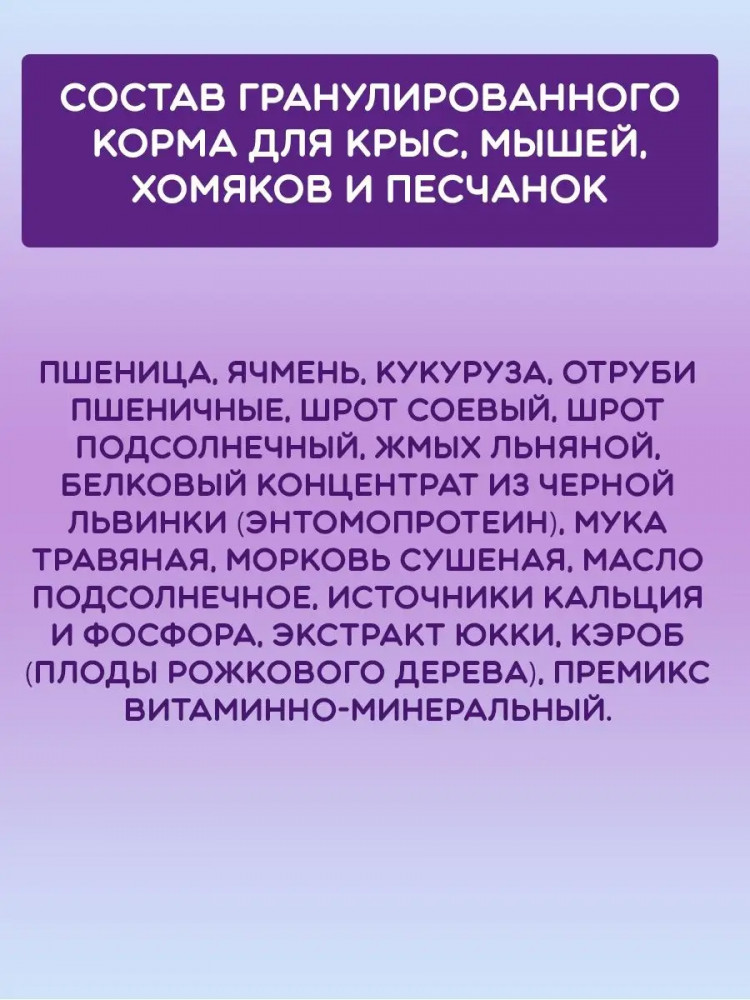 Крыски не сразу начали его есть. Рекомендую делать с ним мешанку с более простым по наполнению кормом