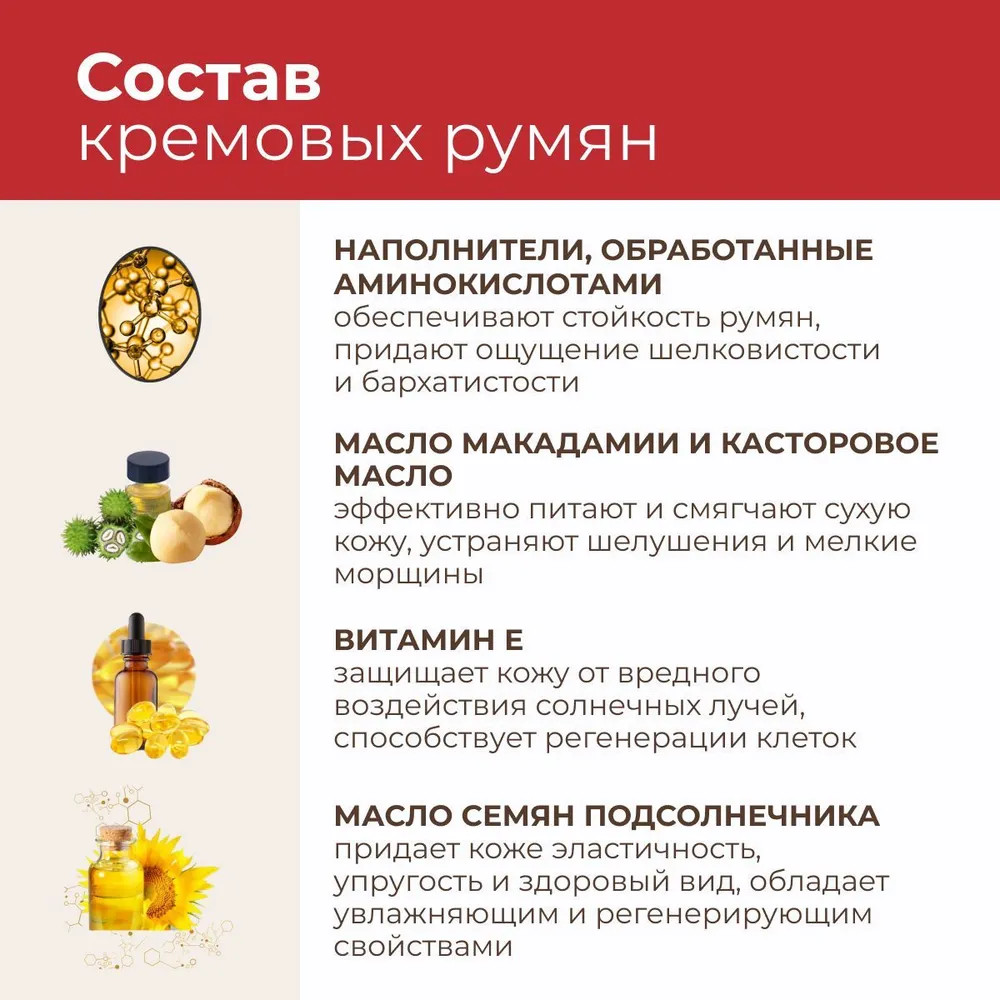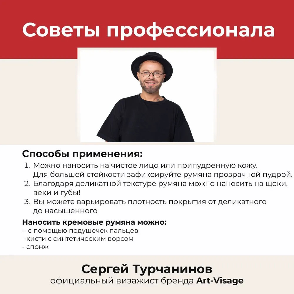 Очень понравились румяна в оттенке 04, но так как тон у данных румян холодный я использую в сочетании с оттенком 02, румяна очень приятные на ощупь, консистенция кремовая не растекается легко смешивается с другими оттенками марки Арт-Визаж, можно наносить и по назначению как румяна, как на тон, так и просто на очищенную кожу лица, как базу(подложку) под тени, тени отлично держатся, не осыпаются, также можно наносить и как помаду!! Мне очень понравились румяна.