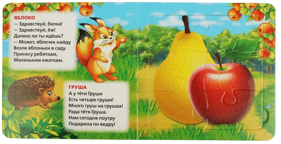 Данная книга выполняет сразу 2 функции: это и книга для чтения, и игра в пазлы. На каждом развороте малыша ждёт интересный стих Марины Дружининой, а также яркий пазл с изображением фруктов, ягод или овощей. Книжка изготовлена из плотного картона, поэтому мамы могут не опасаться, что ребёнок порвёт странички. Благодаря удобному формату книгу можно взять с собой в дорогу.