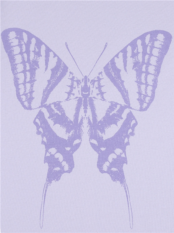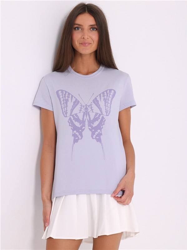 Футболка выполнена из кулира — легкого хлопкового полотна. Изделие свободного покроя с короткими рукавами и округлым вырезом горловины. Украшено дизайнерским принтом «Тень бабочки».