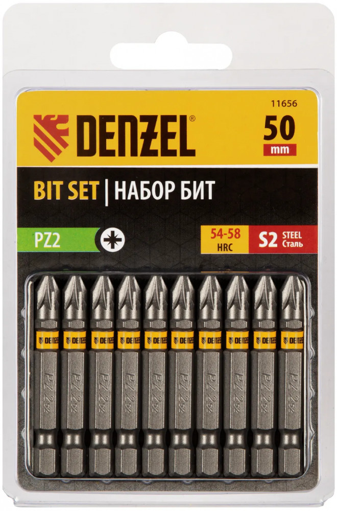 Набор бит PZ2 × 50 мм Denzel включает в себя 10 насадок из стали S2 с хвостовиком 1/4"", рассчитанных на работу с шуруповертом. Оснастка служит для монтажа и демонтажа шурупов, саморезов и других резьбовых соединений. Шлиц PZ имеет 4 дополнительных ребра, за счет чего предотвращается проскальзывание биты в крепеже, повышаются точность и эффективность работ. Удлиненное до 50 мм основание облегчает работу в труднодоступных местах.