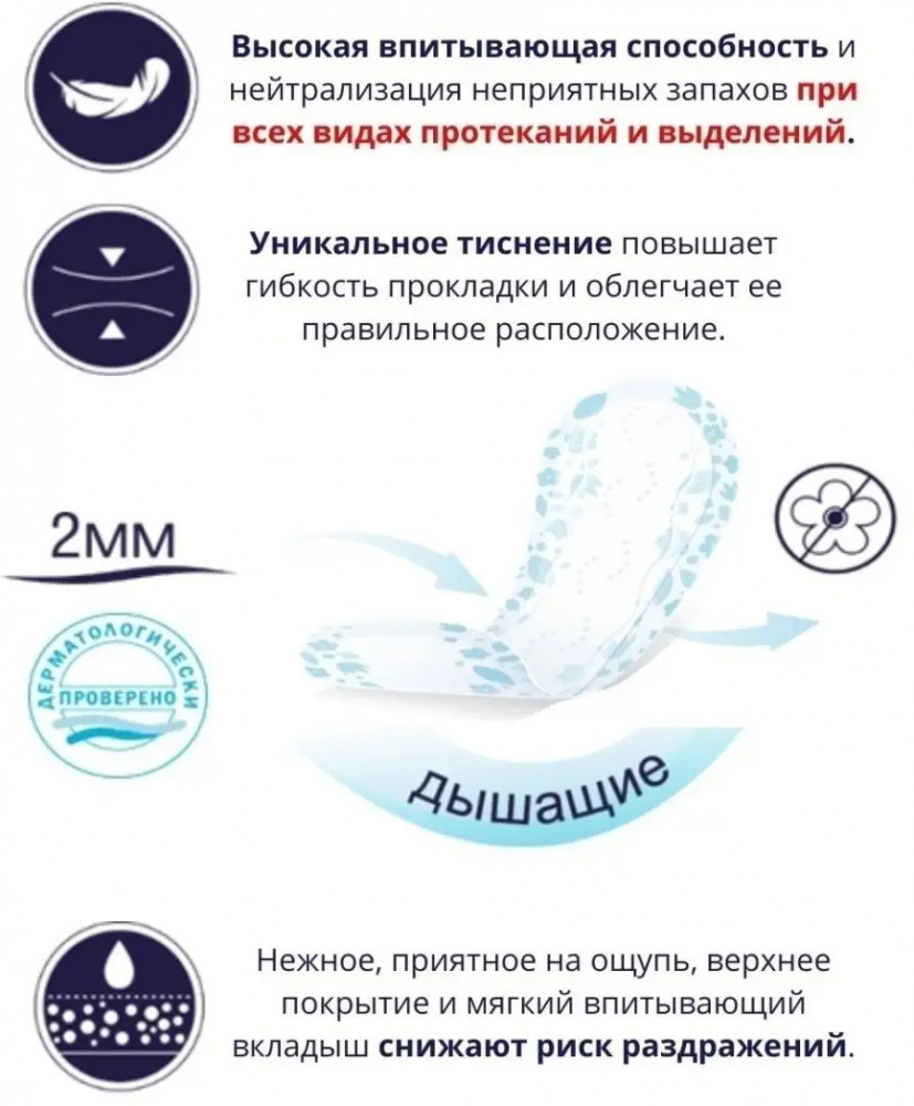 💳 Оплатить за товар можно при получении 🇰🇿 Есть бесплатная доставка по Казахстану от 1 дня 🎁 Копите бонусы с каждой покупки Уникальное тиснение дышащих ежедневных прокладок Panty Ultra Normal делает прокладку еще более гибкой и удобной. Нежное, приятное на ощупь, верхнее покрытие и мягкий впитывающий вкладыш снижают риск раздражений. Ежедневки Ultra имеют высокую впитывающую способность, в том числе и при всех видах протеканий и выделений. В составе суперабсорбент, который быстро и надежно удерживает влагу внутри. Толщина прокладок всего 2 мм — идеально подходит к нижнему белью. Ежедневки обладают функцией нейтрализация запаха. Прокладки размера normal подходят для использования в обычные дни или в последние дни менструации, когда есть небольшие выделения. |