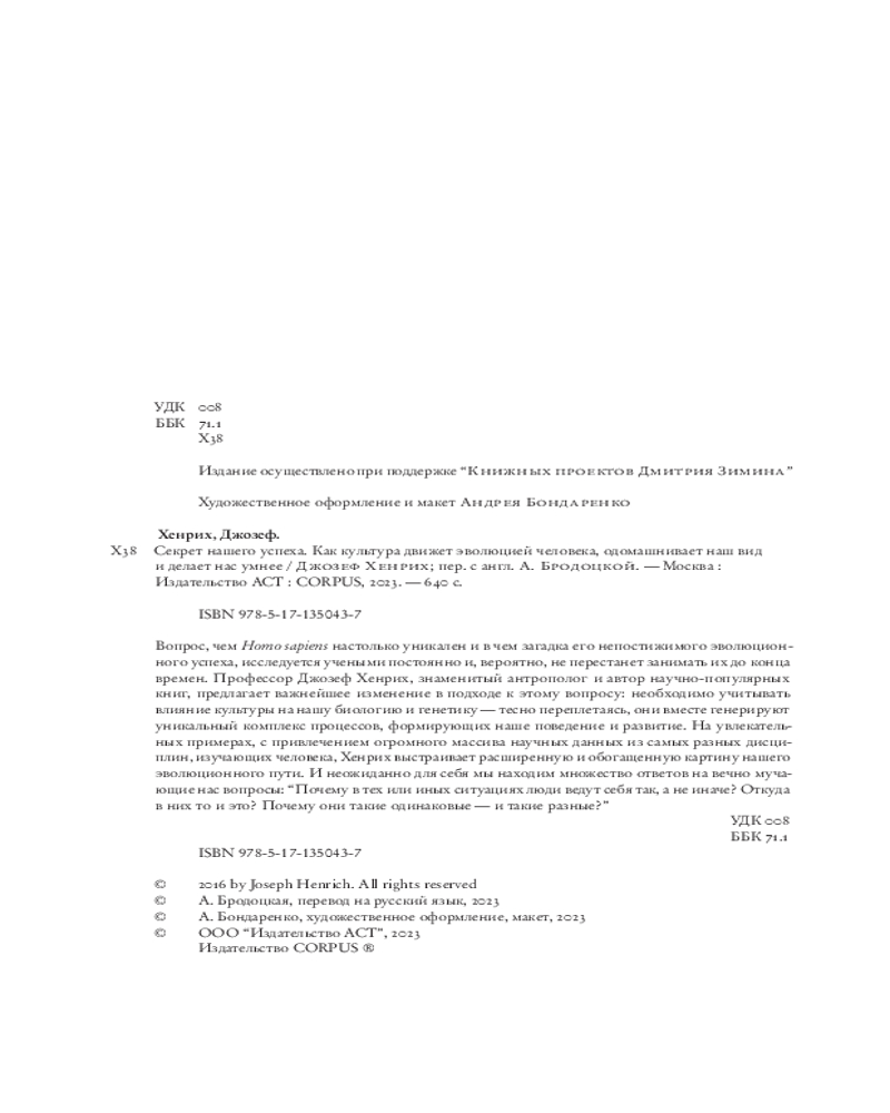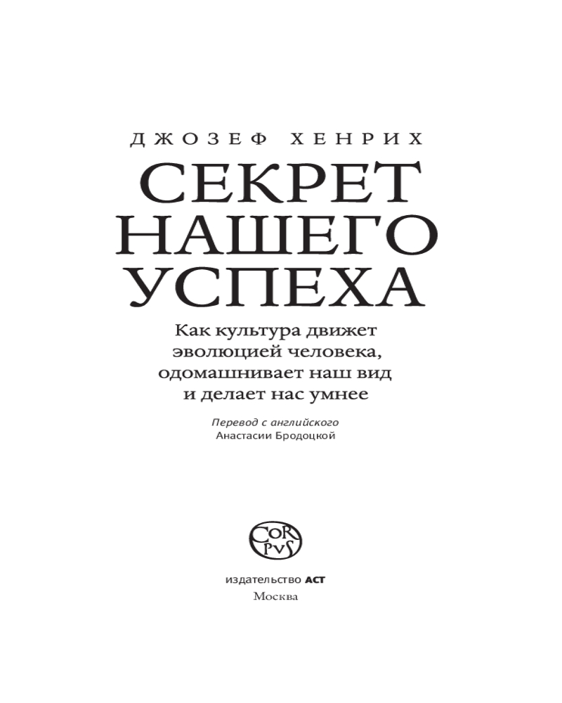 💳 Оплатить за товар можно при получении 🇰🇿 Есть бесплатная доставка по Казахстану от 1 дня 🎁 Копите бонусы с каждой покупки Серия: Corpus. Вопрос, чем Homo sapiens настолько уникален и в чем загадка его непостижимого эволюционного успеха, исследуется учеными постоянно и, вероятно, не перестанет занимать их до конца времен. Профессор Джозеф Хенрих, знаменитый антрополог и автор научно-популярных книг, предлагает важнейшее изменение в подходе к этому вопросу: необходимо учитывать влияние культуры на нашу биологию и генетику — тесно переплетаясь, они вместе генерируют уникальный комплекс процессов, формирующих наше поведение и развитие. |