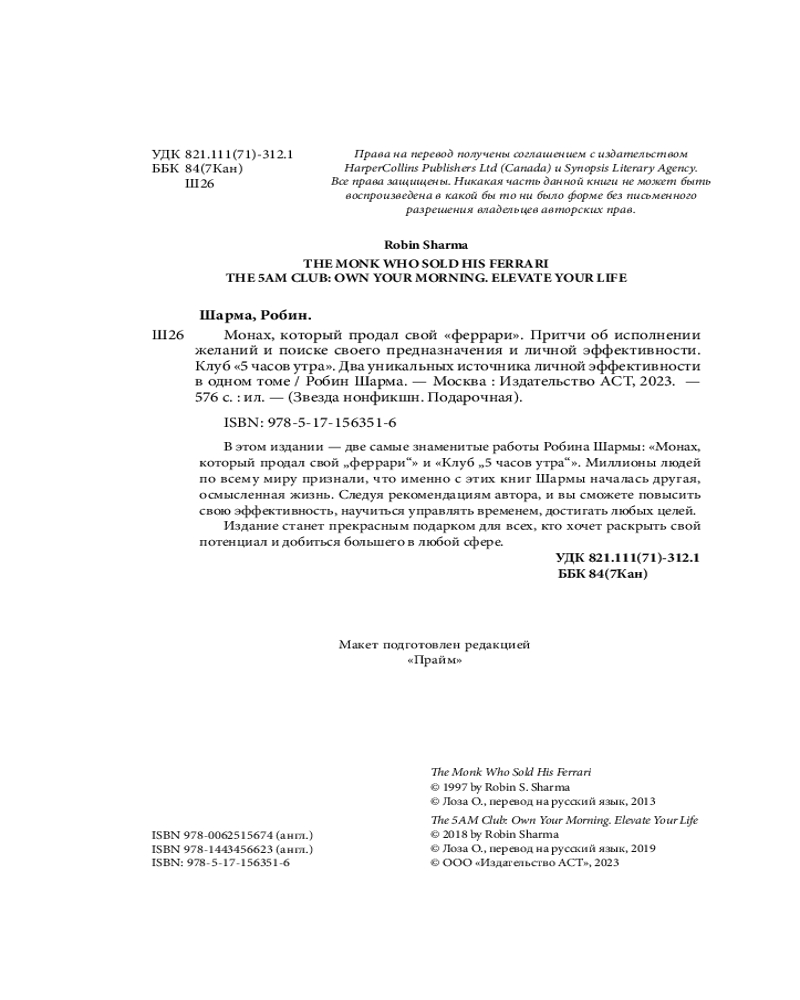 | Монах, который продал свой «феррари». Притчи об исполнении желаний и поиске своего предназначения и личной эффективности. Клуб «5 часов утра». Два уникальных источника личной эффективности в одном томе Робин С. Шарма +86 (бонусов)