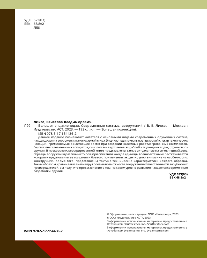 💳 Оплатить за товар можно при получении 🇰🇿 Есть бесплатная доставка по Казахстану от 1 дня 🎁 Копите бонусы с каждой покупки Серия: Большая коллекция Данное издание познакомит читателя с основными видами современных оружейных систем, находящихся на вооружении многих армий мира. Энциклопедия охватывает широкий спектр технических новаций, применяемых в настоящее время при создании наземных роботизированных комплексов, беспилотных летательных аппаратов, самолетов и вертолетов, кораблей и подводных лодок, стрелкового оружия. В прекрасно иллюстрированной книге представлены самые актуальные на сегодняшний день образцы вооружения различных типов, при описании каждой единицы военной техники рассказывается история и предпосылки ее создания и боевого применения, акцентируется внимание на особенностях конструкции. Кроме того, представлены тактико-технические характеристики каждого образца. Таким образом, сравнивая и анализируя боевые возможности вооружения отечественных и зарубежных производителей, вы получите представление о том, на каком уровне развития находятся современные разработки оружия. |
