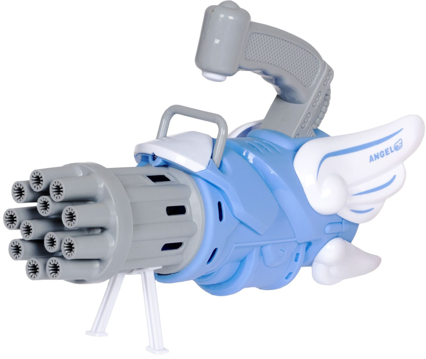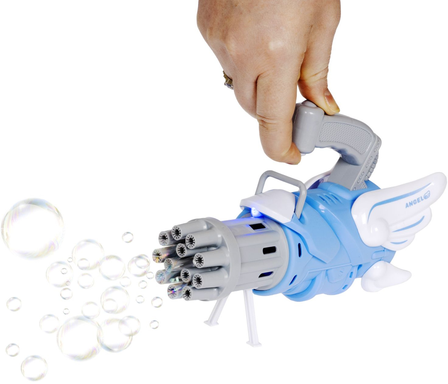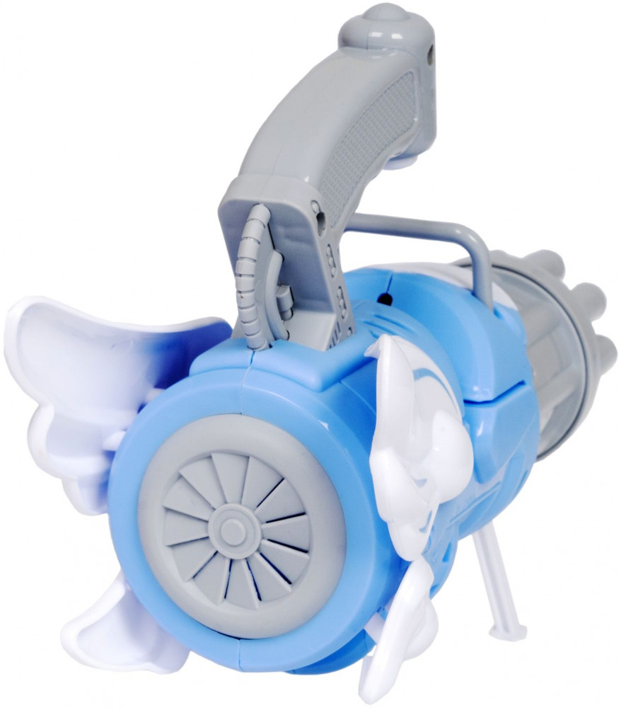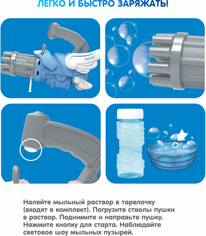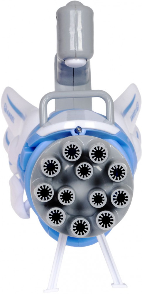 Работает мыльная пушка очень просто. Налейте мыльный раствор в тарелочку. Погрузите стволы пушки в раствор. Поднимите пушку и нажмите кнопку для старта. Запускайте световое шоу мыльных пузырей сразу из 12 стволов! Размер пушки 17,5 × 11,5 × 9,5 см. Пушку можно использовать как маленький вентилятор. Актуально в жару!