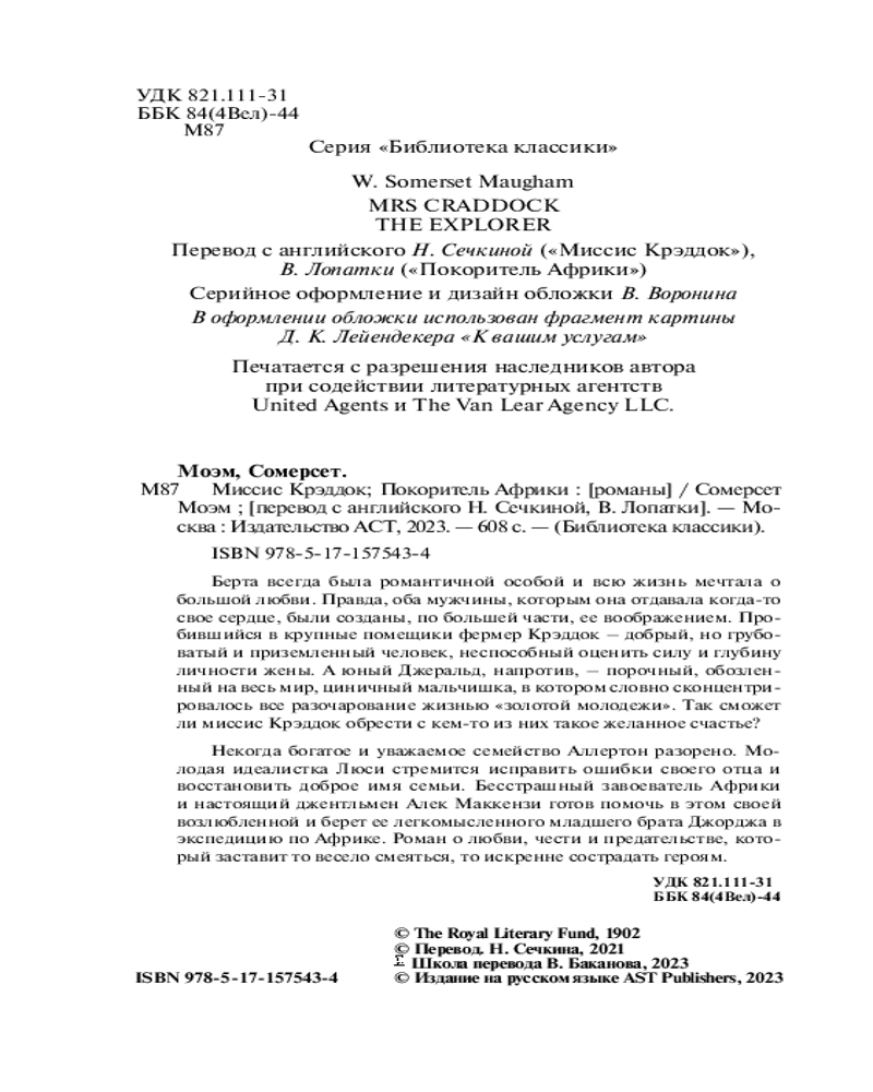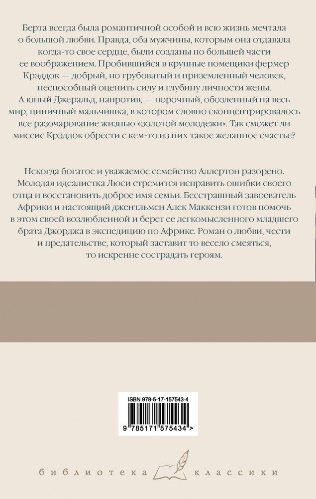 Миссис Крэддок. Покоритель АфрикиВ данный момент этот товар отсутствует в продаже. Возможно, у нас найдется аналогичный или похожий товар здесь. Серия: Библиотека классики Берта всегда была романтичной особой и всю жизнь мечтала о большой любви. Правда, оба мужчины, которым она отдавала когда-то свое сердце, были созданы, по большей части, ее воображением. Пробившийся в крупные помещики фермер Крэддок — добрый, но грубоватый и приземленный человек, неспособный оценить силу и глубину личности жены. А юный Джеральд, напротив, — порочный, обозленный на весь мир, циничный мальчишка, в котором словно сконцентрировалось все разочарование жизнью «золотой молодежи». Так сможет ли миссис Крэддок обрести с кем-то из них такое желанное счастье? |