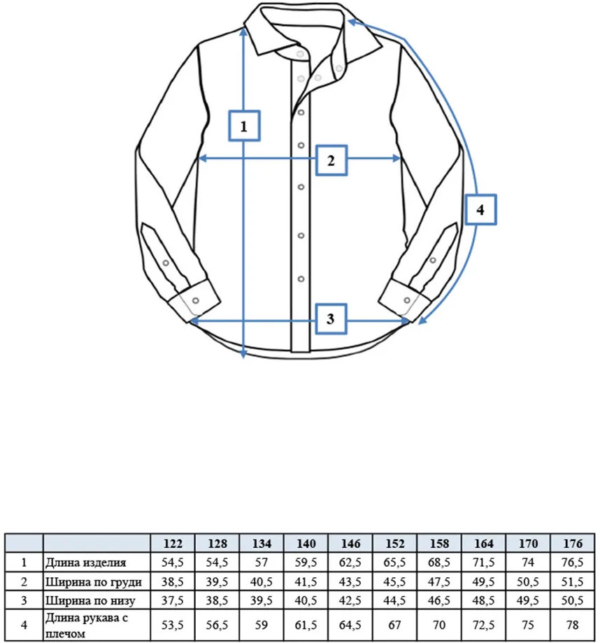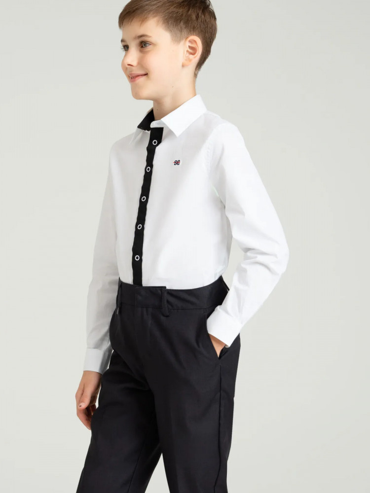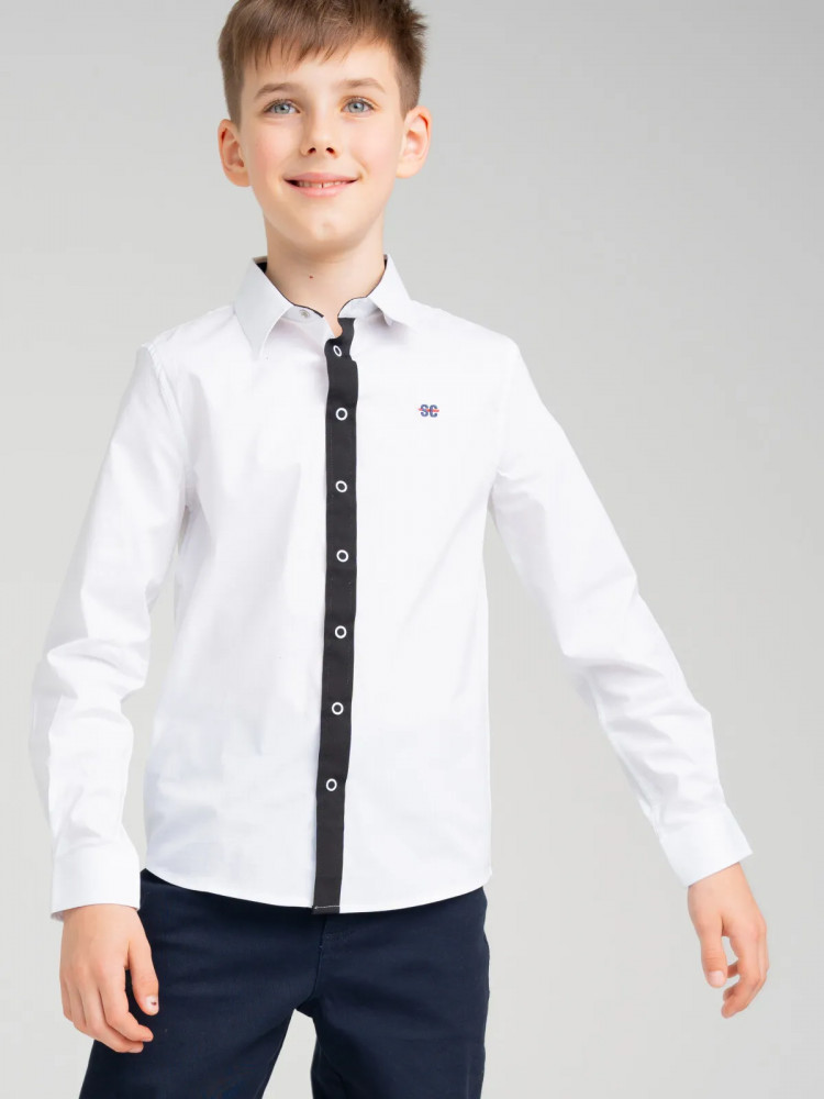 Рубашка текстильная. Посадка regular fit — классический прямой силуэт. Застежка на кнопки. Высокое содержание хлопка — 97%. Благодаря наличию эластана в составе ткани изделие держит форму и меньше мнется. Модель лаконичного дизайна легко сочетать с различными брюками, пиджаками, жилетами. Красивая и практичная сорочка — подходит как для повседневной носки в школу, так и для более торжественных случаев.