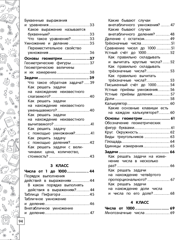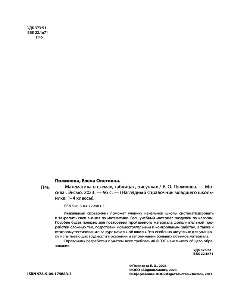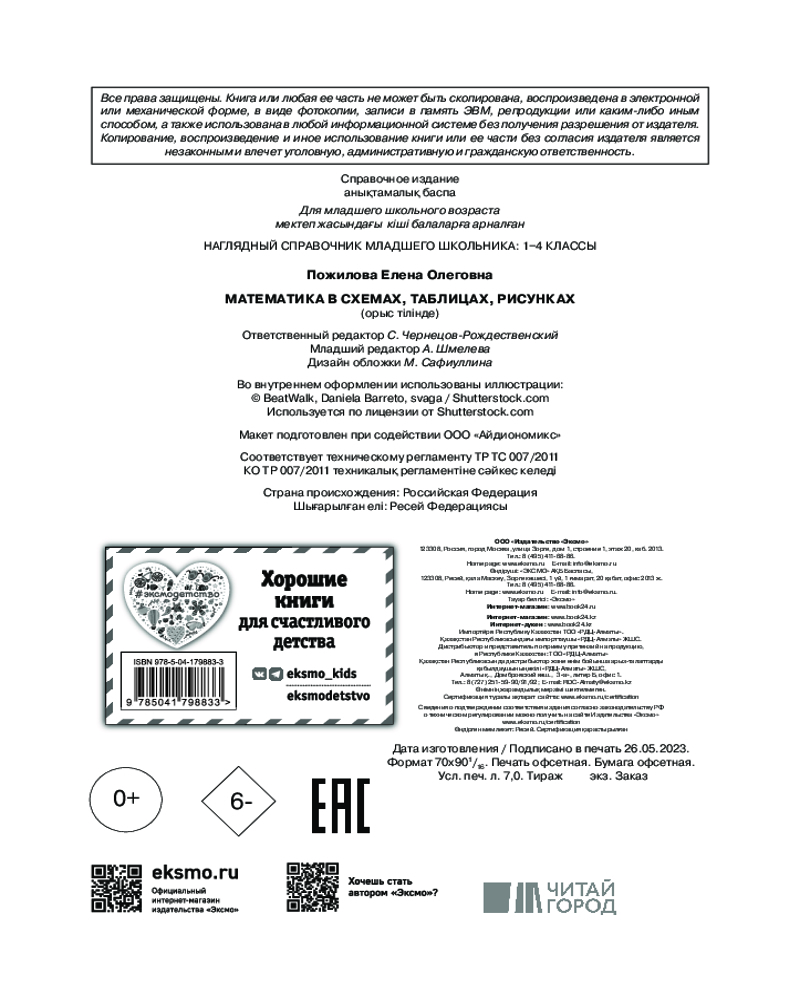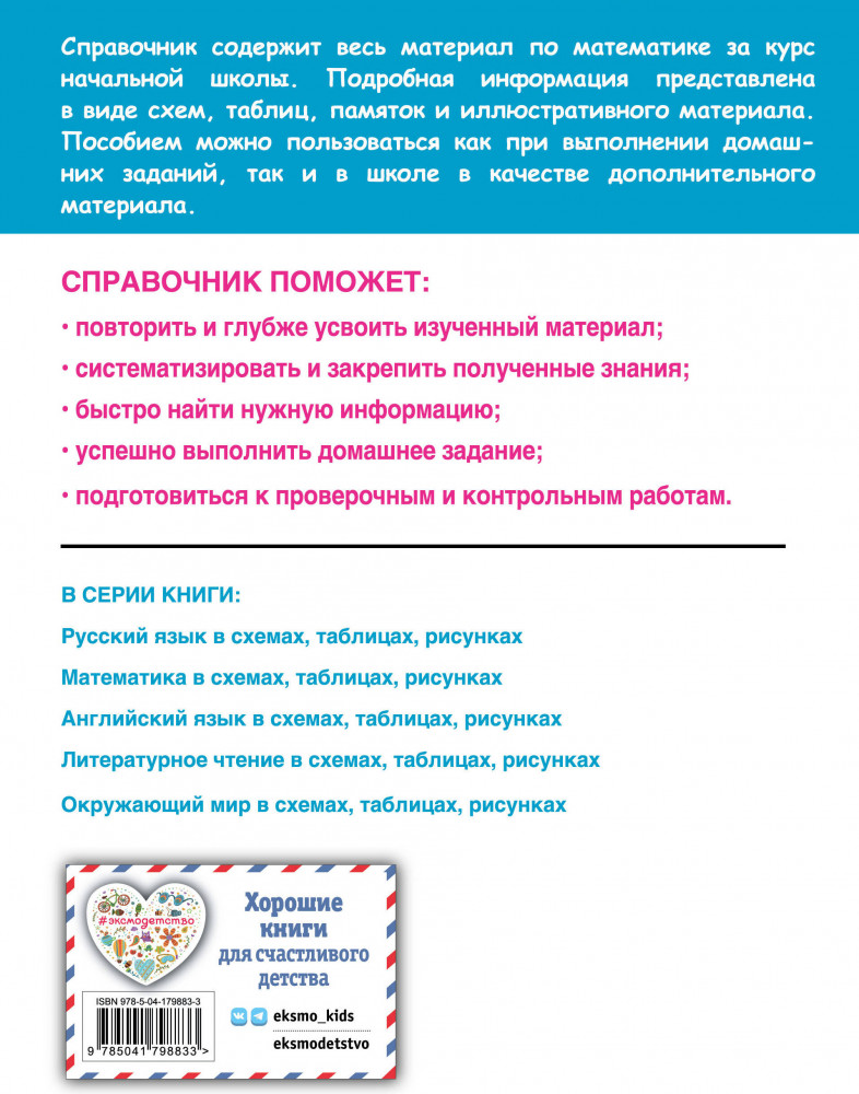 Математика в схемах, таблицах, рисункахВ данный момент этот товар отсутствует в продаже. Возможно, у нас найдется аналогичный или похожий товар здесь. Серия: Наглядный справочник младшего школьника: 1–4 классы В справочнике представлен весь материал по математике за курс начальной школы в наглядной и доступной форме — в виде таблиц, схем и рисунков. С его помощью ученик сможет систематизировать свои знания, повторить и закрепить пройденный материал, дополнительно проработать проблемные темы, подготовиться к самостоятельным и контрольным работам, а также к итоговой аттестации за курс начальной школы по математике. |