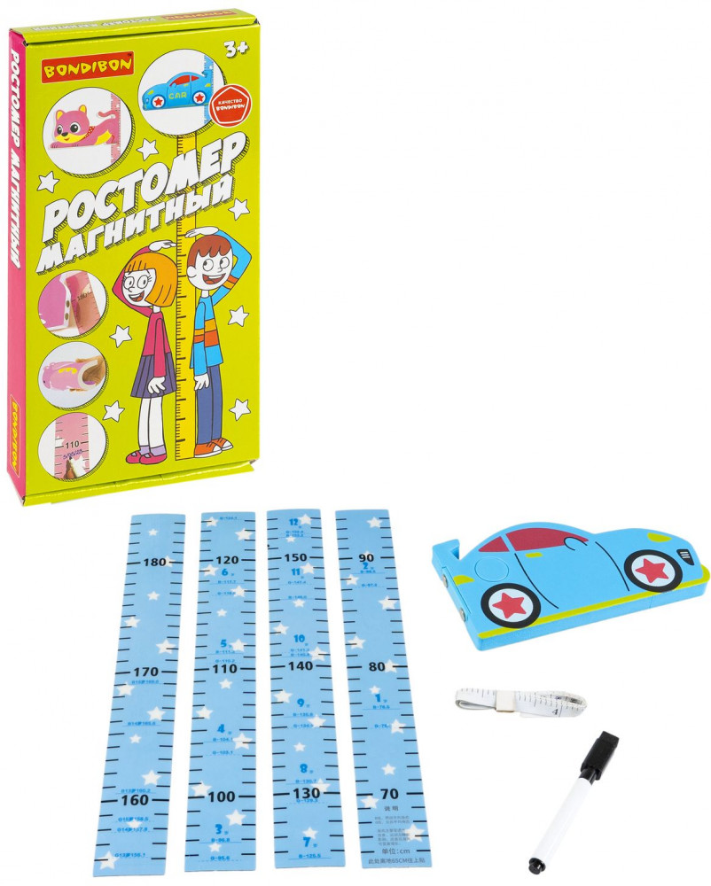 Bondibon Ростомер магнитный «Машинка»В данный момент этот товар отсутствует в продаже. Возможно, у нас найдется аналогичный или похожий товар здесь. Данный ростомер включает в себя 4 измерительных линии на магнитной основе, объемную тематическую 3D-фигуру, с помощью которой удобно отмечать рост ребенка, маркер, мультяшные разноцветные стикеры и измерительную ленту. Чтобы удачно разместить инструмент на стене, ее необходимо предварительно очистить. Измерительные линии крепятся с помощью специального клеевого основания, которое не оставляет следов и дает возможность переклеивать ростомер в другие места. Маркером можно ставить отметки, а затем стирать с помощью встроенной губки. Используйте ростомер на очищенных и ровных поверхностях. Ростомер рассчитан на детей от 1 до 4 лет и ростом до 180 см. |