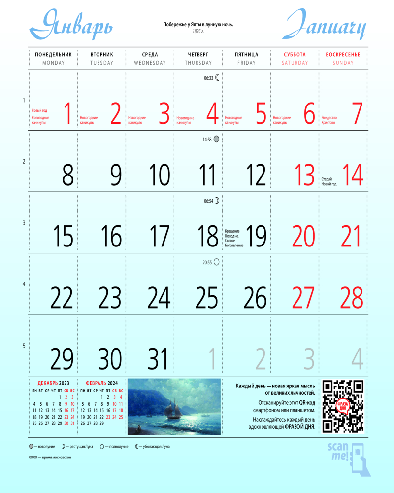 Практичный и эстетичный, этот календарь каждый месяц будет радовать вас. Прекрасные картины органично дополнят любой интерьер и помогут планировать время. В этом календаре представлены шедевры кисти Айвазовского.