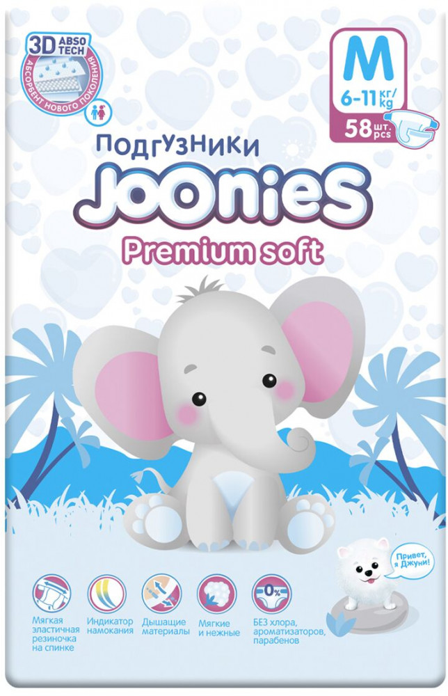 • все материалы в подгузниках TM JOONIES PremiumSoft «дышащие» — кожа малыша дышит, находясь в подгузнике;