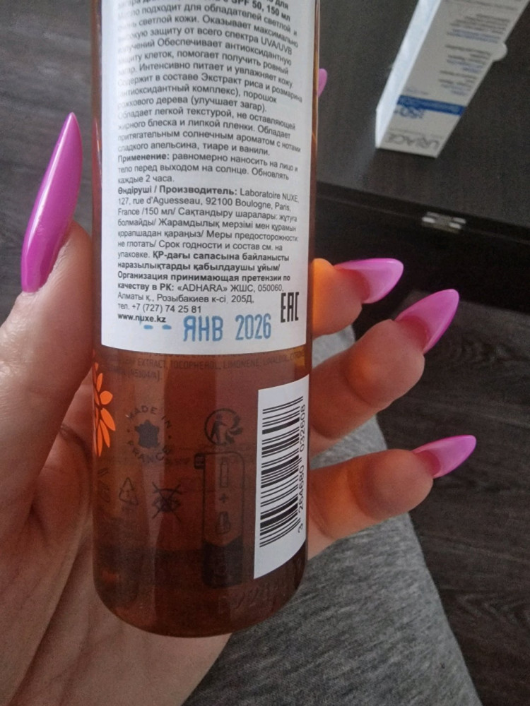 💳 Оплатить за товар можно при получении 🇰🇿 Есть бесплатная доставка по Казахстану от 1 дня 🎁 Копите бонусы с каждой покупки Серия: Nuxe Sun Это солнцезащитное масло для лица и тела содержит экстракты цветка Кау Пе, который обеспечивает идеальный загар и защищает клетки от преждевременного старения. Легкая текстура не оставляет ощущения пленки на теле, не содержит спирт, растительная формула смягчает и питает кожу. Отлично защищает кожу от нежелательных последствий в виде: сгорания и потери влаги. Вы получите ровный, красивый и безопасный загар. Невероятный аромат сладкого апельсина, гардении и ванили окунет Вас в яркий тропический мир с его экзотической природой. До 92% ингредиентов натурального происхождения. |