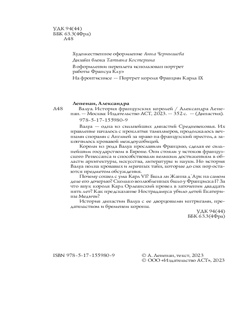 💳 Оплатить за товар можно при получении 🇰🇿 Есть бесплатная доставка по Казахстану от 1 дня 🎁 Копите бонусы с каждой покупки Серия: Династия Валуа — одна из сильнейших династий Средневековья. Их правление началось с проклятия тамплиеров, продолжалось вечными спорами с Англией за право на французский престол, а закончилось кровавой междоусобицей. Короли из рода Валуа прославили Францию, сделав ее сильнейшим государством в Европе. Они стояли у истоков французского Ренессанса и способствовали великим достижениям в области архитектуры, искусства, литературы и науки. Но история Валуа полна кровавых и мрачных тайн, которые до сих пор остаются предметом обсуждения. |