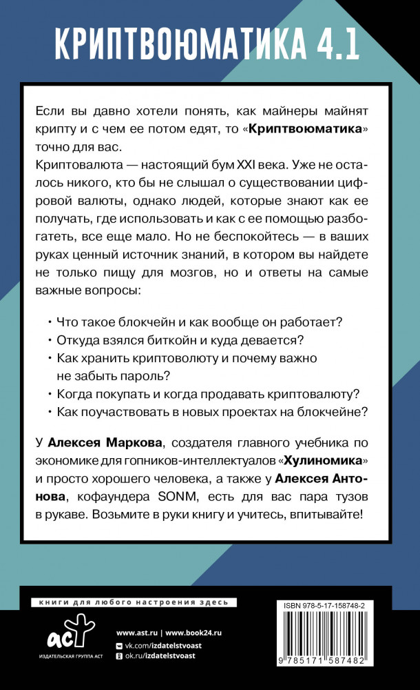 💳 Оплатить за товар можно при получении 🇰🇿 Есть бесплатная доставка по Казахстану от 1 дня 🎁 Копите бонусы с каждой покупки Серия: Эксклюзивный научпоп Если вы давно хотели понять, как майнеры майнят крипту и с чем ее потом едят, то «Криптвоюматика» точно для вас. |