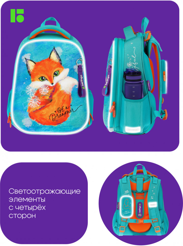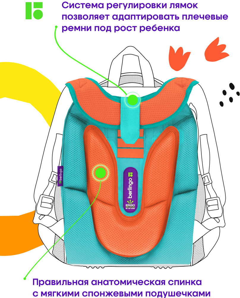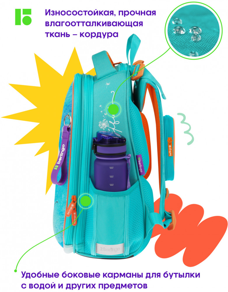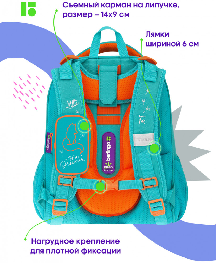 💳 Оплатить за товар можно при получении 🇰🇿 Есть бесплатная доставка по Казахстану от 1 дня 🎁 Копите бонусы с каждой покупки Серия: Expert Max Эргономичный ранец Berlingo серии Expert Max для детей младшего и среднего школьного возраста выполнен из экологичного ЭВА-материала с покрытием из высокопрочной нейлоновой ткани кордура. Вес школьного ранца − 1 кг, объём − 17,5 л. За счет особой структуры нити в ткани достигнута четырёхкратная стойкость к истиранию по сравнению с простым нейлоном. Кордура обладает водоотталкивающими свойствами и легко чистится. Благодаря анатомической вентилируемой спинке, регулируемым по длине и высоте лямкам, а также нагрудному креплению ранец плотно фиксируется на спине ребенка, что помогает равномерно распределить нагрузку и сохранить правильную осанку. Ранец для школы имеет 2 отделения, 2 боковых кармана на резинке, съемный кошелек на лямке для быстрого доступа к необходимым вещам. Внутри предусмотрены разделители для учебных пособий, органайзер для письменных принадлежностей, карман для мобильного телефона, съемный карабин для ключей и именная карточка для подписи. Уплотненная мягкая ручка и петля для подвешивания к парте делают ранец очень удобным. Дно выполнено из водонепроницаемого материала с пластиковыми ножками для защиты от влаги. Световозвращающие элементы на лямках, передней и боковых частях ранца обеспечивают безопасность ребенка в темное время суток. Особенностью данной модели является наличие дождевика, расположенного в специальном кармашке в верхней части ранца. Дождевик оснащен светоотражающими элементами. Фирменный брелок в подарок. |