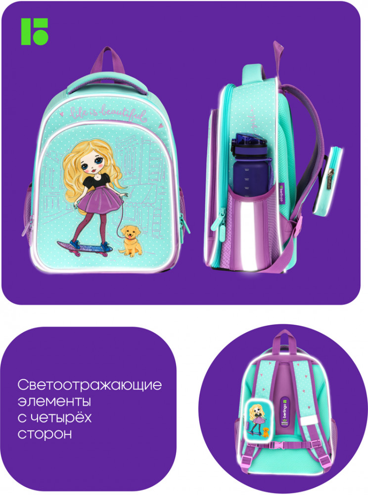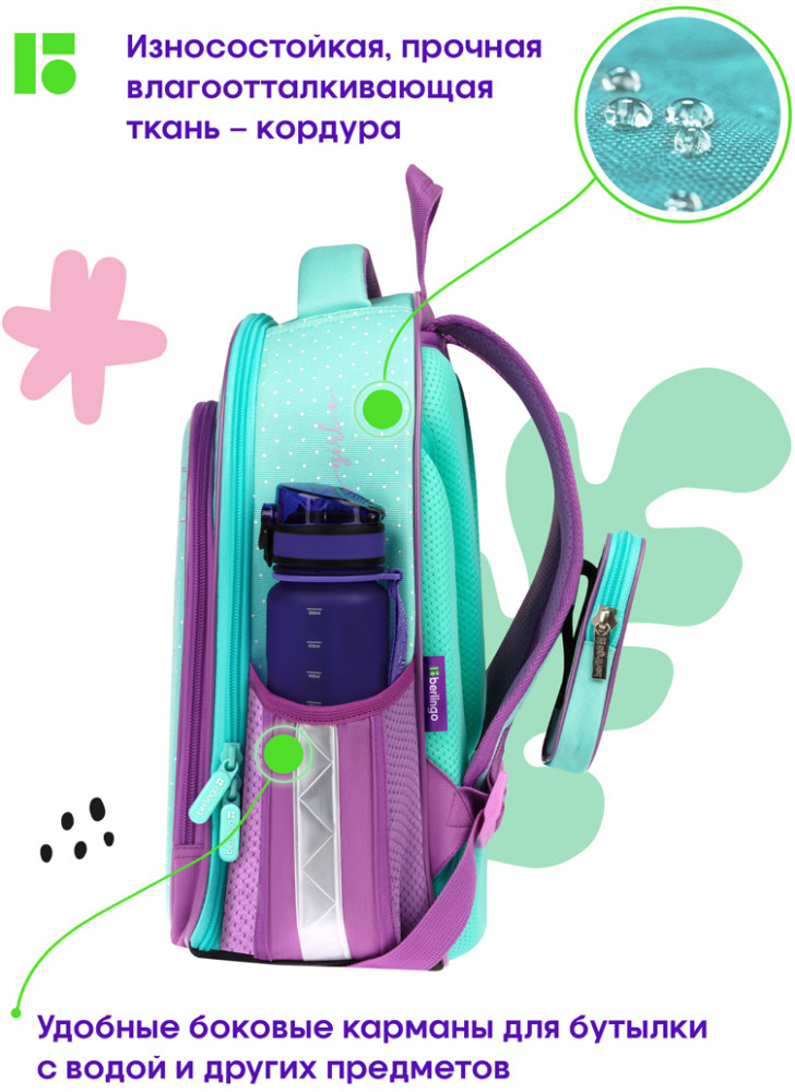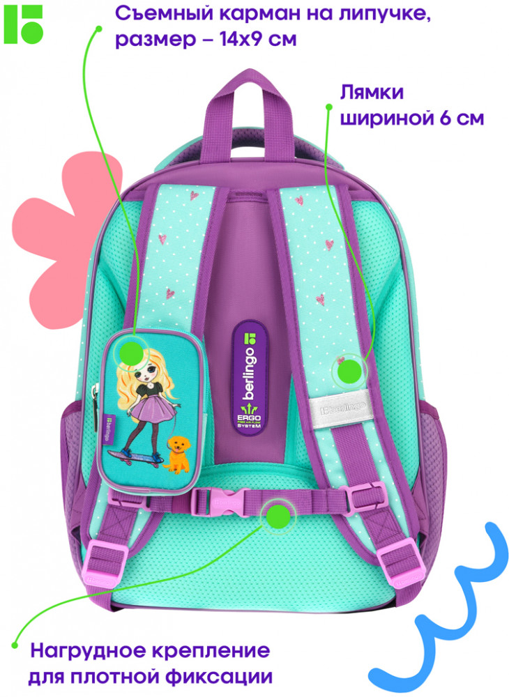 Berlingo Рюкзак «Pretty girl»В данный момент этот товар отсутствует в продаже. Возможно, у нас найдется аналогичный или похожий товар здесь. Серия: Expert Plus Эргономичный ранец Berlingo серии Expert Plus подходит для детей младшего и среднего школьного возраста. Модель выполнена из легкого экологичного ЭВА-материала с покрытием из высокопрочной нейлоновой ткани кордура, которая обладает водоотталкивающими свойствами и легко чистится. Ранец объёмом 16,5 литров имеет 2 отделения, 2 боковых кармана, съемный кошелек на лямке для быстрого доступа к необходимым вещам. Внутри предусмотрены разделители для учебных пособий, а также органайзер, которые помогают ребенку поддерживать порядок и аккуратно хранить школьные принадлежности. Благодаря анатомической вентилируемой спинке, а также регулируемым по длине лямкам и нагрудному креплению ранец плотно фиксируется на спине ребенка, равномерно распределяется нагрузка и сохраняется правильная осанка. Ранец оснащен усовершенствованной конструкцией лямок с амортизирующим эффектом, которая помогает снизить нагрузку на плечи и спину ребенка. Дно выполнено из водонепроницаемого материала и оснащено пластиковыми ножками для защиты содержимого от влаги. Ранец оснащен плотной ручкой и петлей для подвешивания. Световозвращающие элементы на лямках, передней и боковой частях ранца обеспечивают безопасность в темное время суток. Вес 1 кг. |