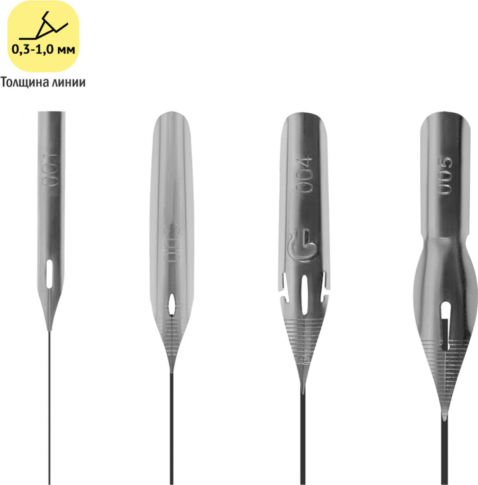 Перья позволяют наносить линии разной толщины и нажима, а также прорабатывать самые мелкие детали рисунка. В наборе удобный чёрный пластиковый эргономичный держатель с soft-touch-покрытием. Набор упакован в пакет.