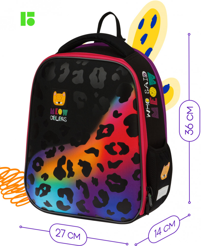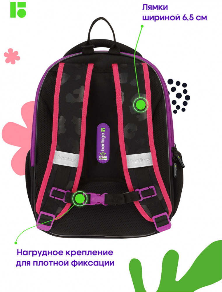Berlingo Рюкзак «Meow colors»В данный момент этот товар отсутствует в продаже. Возможно, у нас найдется аналогичный или похожий товар здесь. Серия: Expert Mini Эргономичный компактный ранец для девочки Berlingo серии Expert Mini подходит для детей младшего и среднего школьного возраста. Модель выполнена из экологичного ЭВА-материала с покрытием из высокопрочного нейлона. Ранец объёмом 13,5 литров имеет 2 отделения, одно из которых расположено у спинки и предназначено для учебных пособий формата А4+, 2 боковых кармана на резинке. Внутри предусмотрены разделители для учебных пособий и именная карточка для подписи. Благодаря анатомической вентилируемой спинке, регулируемым по длине лямкам, а также нагрудному креплению ранец плотно фиксируется на спине ребенка, что помогает равномерно распределить нагрузку и сохранить правильную осанку. Уплотненная мягкая ручка и петля для подвешивания к парте делают ранец очень удобным. Дно выполнено из водонепроницаемого материала с пластиковыми ножками для защиты от влаги. Световозвращающие элементы на лямках, передней и боковых частях ранца обеспечивают безопасность ребенка в темное время суток. Мешок для обуви в комплекте, предусмотрено крепление мешка к ранцу с помощью специальных фиксаторов. Вес менее 1 кг. |