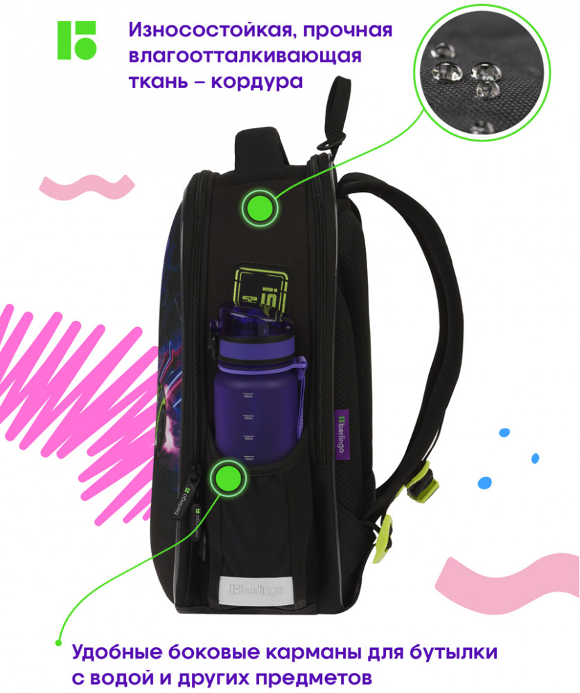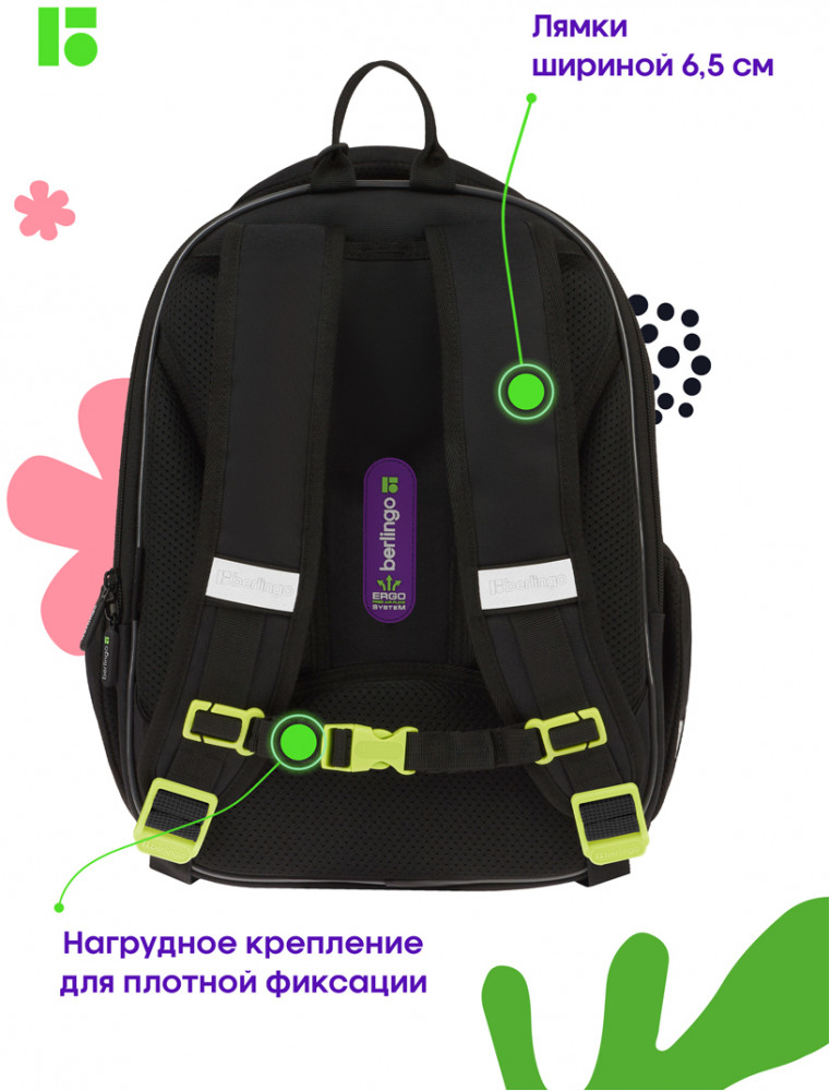 Berlingo Рюкзак «Fury road»В данный момент этот товар отсутствует в продаже. Возможно, у нас найдется аналогичный или похожий товар здесь. Серия: Expert Mini Эргономичный компактный ранец для девочки Berlingo серии Expert Mini подходит для детей младшего и среднего школьного возраста. Модель выполнена из экологичного ЭВА-материала с покрытием из высокопрочного нейлона. Ранец объёмом 13,5 литров имеет 2 отделения, одно из которых расположено у спинки и предназначено для учебных пособий формата А4+, 2 боковых кармана на резинке. Внутри предусмотрены разделители для учебных пособий и именная карточка для подписи. Благодаря анатомической вентилируемой спинке, регулируемым по длине лямкам, а также нагрудному креплению ранец плотно фиксируется на спине ребенка, что помогает равномерно распределить нагрузку и сохранить правильную осанку. Уплотненная мягкая ручка и петля для подвешивания к парте делают ранец очень удобным. Дно выполнено из водонепроницаемого материала с пластиковыми ножками для защиты от влаги. Световозвращающие элементы на лямках, передней и боковых частях ранца обеспечивают безопасность ребенка в темное время суток. Мешок для обуви в комплекте, предусмотрено крепление мешка к ранцу с помощью специальных фиксаторов. Вес менее 1 кг. |