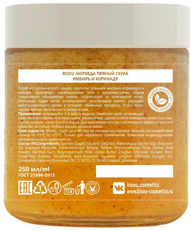 Bisou Скраб для тела пряный «Имбирь и кориандр»запах сахарный объём В данный момент этот товар отсутствует в продаже. Возможно, у нас найдется аналогичный или похожий товар здесь. Серия: Aromacologie Скраб для тела из органического сахара, пропитан пряными маслами кориандра и имбиря, производит скрабирование тела с аромамассажем. Масла стимулируют обновление клеток, подтягивают и тонизируют кожу. Имбирная пудра мягко отшелушивает ороговевшие клетки, улучшает микроциркуляцию крови и ускоряет обменные процессы. Кожа после скраба мягкая, напитанная и увлажненная. |