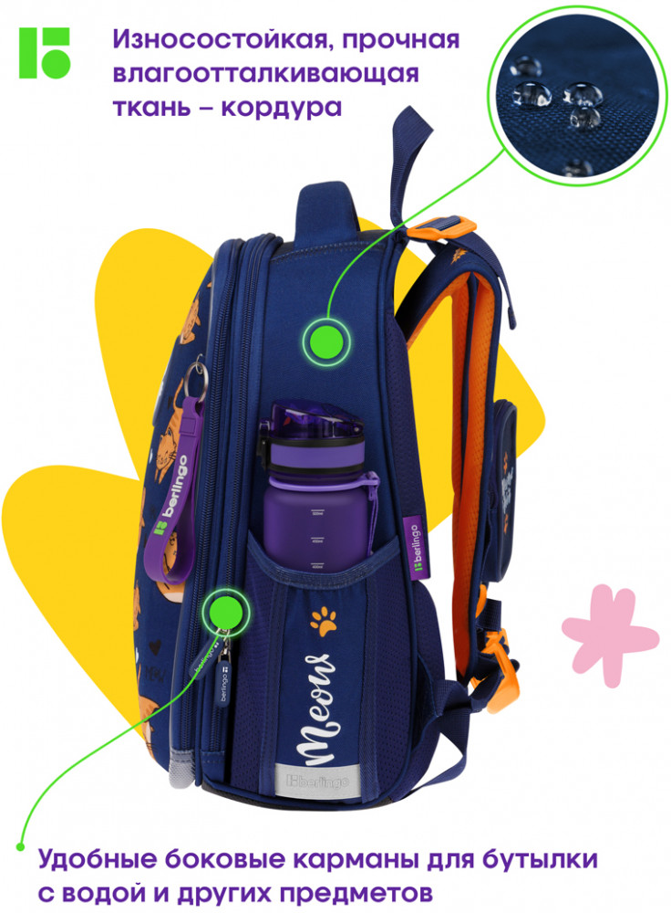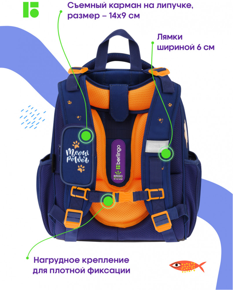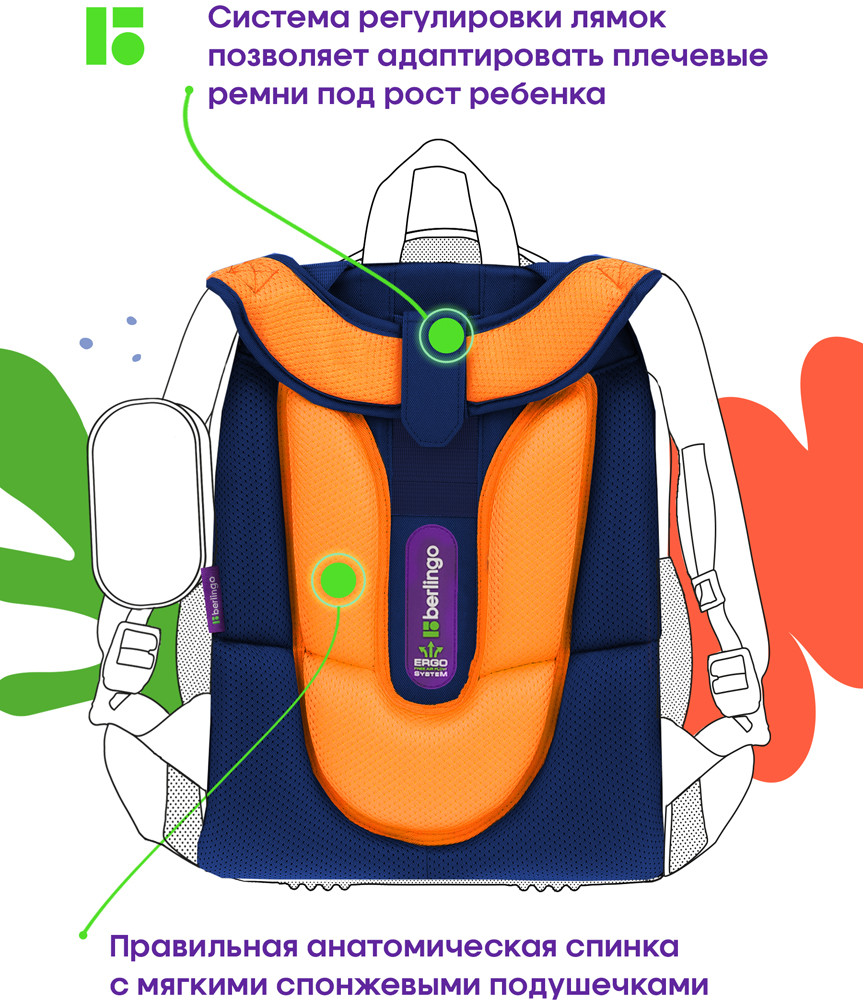 💳 Оплатить за товар можно при получении 🇰🇿 Есть бесплатная доставка по Казахстану от 1 дня 🎁 Копите бонусы с каждой покупки Серия: Expert Эргономичный ранец Berlingo серии Expert подходит для детей младшего и среднего школьного возраста. Модель выполнена из экологичного ЭВА-материала с покрытием из высокопрочной нейлоновой ткани кордура, которая обладает водоотталкивающими свойствами и легко чистится. Ранец объёмом 16,5 литров имеет 2 отделения, 2 боковых кармана на резинке, съемный кошелек на лямке для быстрого доступа к необходимым вещам. Внутри предусмотрены разделители для учебных пособий, органайзер для письменных принадлежностей, карман для мобильного телефона, съемный карабин для ключей и именная карточка для подписи. Благодаря анатомической вентилируемой спинке, регулируемым по длине и высоте лямкам, а также нагрудному креплению ранец плотно фиксируется на спине ребенка, что помогает равномерно распределить нагрузку и сохранить правильную осанку. Уплотненная мягкая ручка и петля для подвешивания к парте делают ранец очень удобным. Дно выполнено из водонепроницаемого материала с пластиковыми ножками для защиты от влаги. Световозвращающие элементы на лямках, передней и боковых частях ранца обеспечивают безопасность ребенка в темное время суток. Фирменный брелок в подарок. Вес ранца менее 1 кг. |