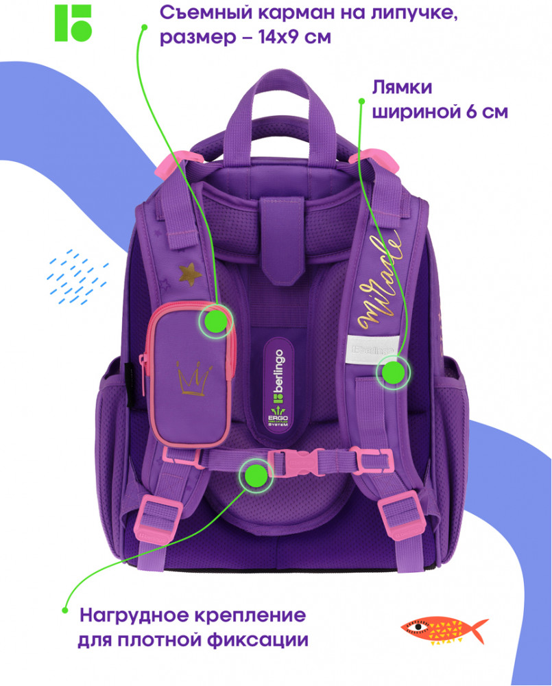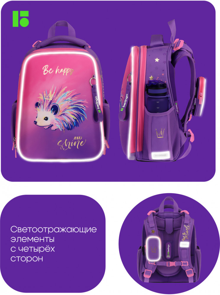 Berlingo Рюкзак «Hedgehog»В данный момент этот товар отсутствует в продаже. Возможно, у нас найдется аналогичный или похожий товар здесь. Серия: Expert Эргономичный ранец Berlingo серии Expert подходит для детей младшего и среднего школьного возраста. Модель выполнена из экологичного ЭВА-материала с покрытием из высокопрочной нейлоновой ткани кордура, которая обладает водоотталкивающими свойствами и легко чистится. Ранец объёмом 16,5 литров имеет 2 отделения, 2 боковых кармана на резинке, съемный кошелек на лямке для быстрого доступа к необходимым вещам. Внутри предусмотрены разделители для учебных пособий, органайзер для письменных принадлежностей, карман для мобильного телефона, съемный карабин для ключей и именная карточка для подписи. Благодаря анатомической вентилируемой спинке, регулируемым по длине и высоте лямкам, а также нагрудному креплению ранец плотно фиксируется на спине ребенка, что помогает равномерно распределить нагрузку и сохранить правильную осанку. Уплотненная мягкая ручка и петля для подвешивания к парте делают ранец очень удобным. Дно выполнено из водонепроницаемого материала с пластиковыми ножками для защиты от влаги. Световозвращающие элементы на лямках, передней и боковых частях ранца обеспечивают безопасность ребенка в темное время суток. Фирменный брелок в подарок. Вес ранца менее 1 кг. |