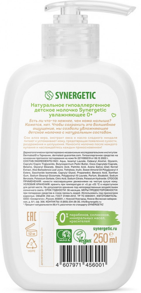 Synergetic Молочко детское натуральное увлажняющееВ данный момент этот товар отсутствует в продаже. Возможно, у нас найдется аналогичный или похожий товар здесь. Серия: Pure & Nature Натуральное гипоаллергенное детское молочко Synergetic увлажняющее 0+ безопасно и эффективно смягчает и защищает детскую кожу от сухости, оно обладает приятным легким ароматом, легко наносится и быстро впитывается. Безопасная формула с высокой концентрацией натуральных компонентов содержит пребиотики инулин и трегалозу, которые нормализуют и сохраняют естественный микробиом кожи. Бисаболол успокаивает и снимает раздражения и покраснения. Экстракт овса — это природный эмолент с выраженными антиоксидантными свойствами, защищающий и восстанавливающий естественную среду нежной кожи ребенка. Сок алоэ вера в сочетании с маслами дерева ши и сладкого миндаля питают и увлажняют кожу, предотвращая появление сухости, раздражения и шелушения. |
