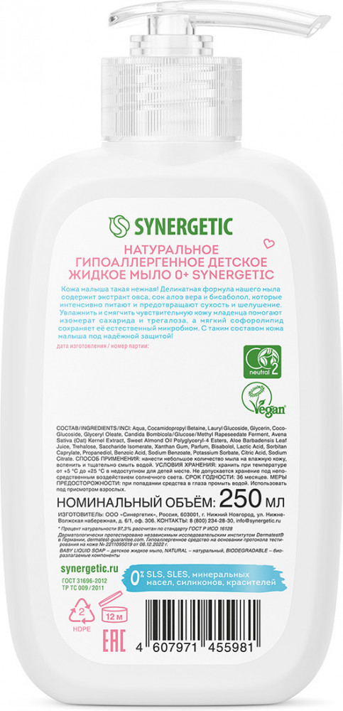 Synergetic Мыло детское натуральное гипоаллергенноеВ данный момент этот товар отсутствует в продаже. Возможно, у нас найдется аналогичный или похожий товар здесь. Серия: Pure & Nature Натуральное гипоаллергенное детское жидкое мыло 0+ Synergetic мягко очищает кожу малыша, сохраняя естественный уровень pH. Мыло хорошо пенится и легко смывается водой. Безопасная, эффективная и гипоаллергенная формула содержит молочную кислоту и пребиотик трегалозу, которые бережно очищают кожу, нормализуют и сохраняют естественный микробиом. |