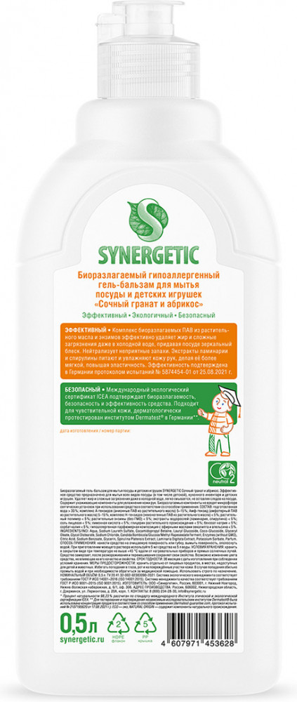 Synergetic Гель-бальзам для мытья посуды и детских игрушек «Сочный гранат и абрикос»