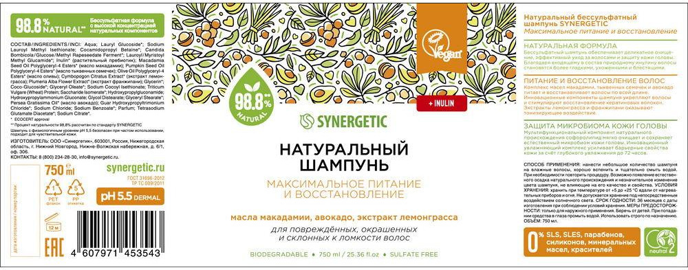 Synergetic Шампунь натуральный бессульфатный «Максимальное питание и восстановление»