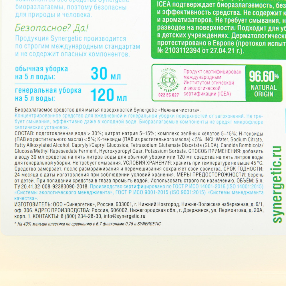 Synergetic Средство для мытья пола и поверхностей «Нежная чистота»