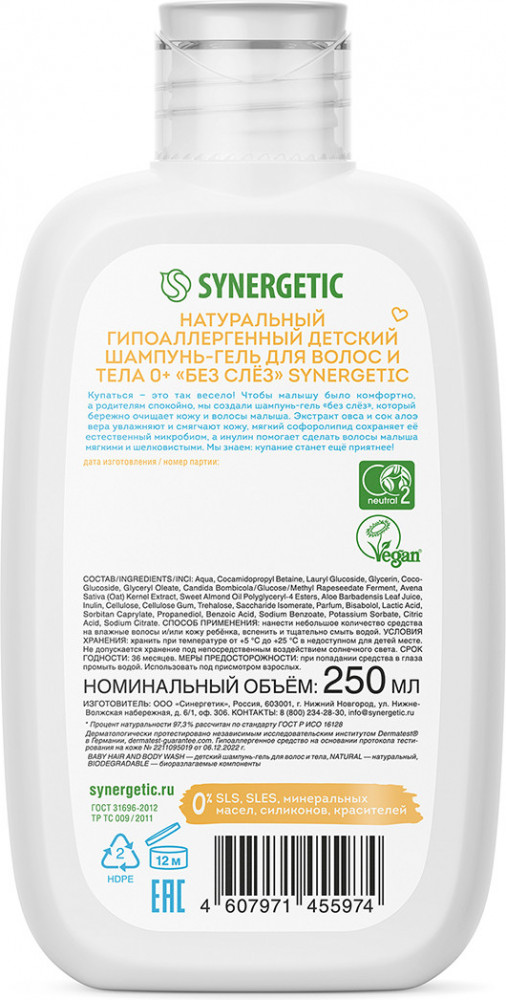Synergetic Шампунь-гель для волос и тела детский натуральный гипоаллергенныйВ данный момент этот товар отсутствует в продаже. Возможно, у нас найдется аналогичный или похожий товар здесь. Серия: Pure & Nature Натуральный гипоаллергенный детский шампунь-гель для волос и тела 0+ «без слез» Synergetic бережно очищает нежную кожу и волосы малыша. Мягкая формула, специально разработанная для младенцев, не раздражает глаза. Безопасная, эффективная и гипоаллергенная формула содержит молочную кислоту, софоролипид и пребиотики инулин и трегалозу, которые бережно очищают кожу, нормализуют и сохраняют естественный микробиом. Бисаболол успокаивает и помогает восстановить барьерные функции кожи. Экстракт овса — это природный эмолент с выраженными антиоксидантными свойствами, питательный, увлажняющий, защищающий и восстанавливающий естественную среду нежной детской кожи. Сок алоэ вера питает и увлажняет кожу, а масло сладкого миндаля регулирует гидролипидный баланс, предотвращая появление сухости, раздражения и шелушения. |