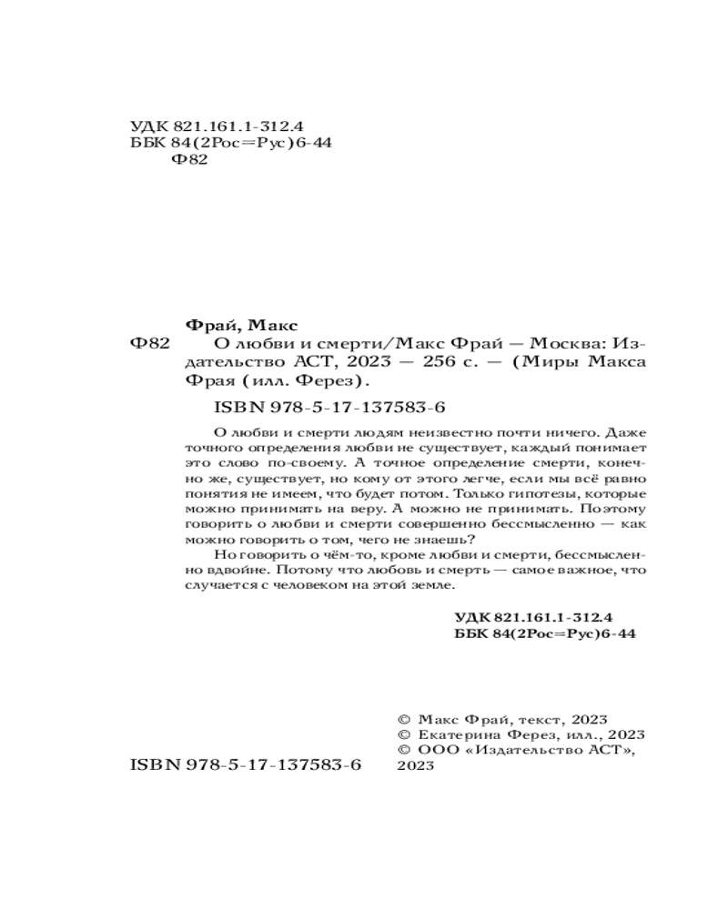 💳 Оплатить за товар можно при получении 🇰🇿 Есть бесплатная доставка по Казахстану от 1 дня 🎁 Копите бонусы с каждой покупки Серия: Миры Макса Фрая (илл. Ферез) О любви и смерти людям неизвестно почти ничего. Даже точного определения любви не существует, каждый понимает это слово по-своему. А точное определение смерти, конечно же, существует, но кому от этого легче, если мы всё равно понятия не имеем, что будет потом. Только гипотезы, которые можно принимать на веру. А можно не принимать. Поэтому говорить о любви и смерти совершенно бессмысленно — как можно говорить о том, чего не знаешь? |