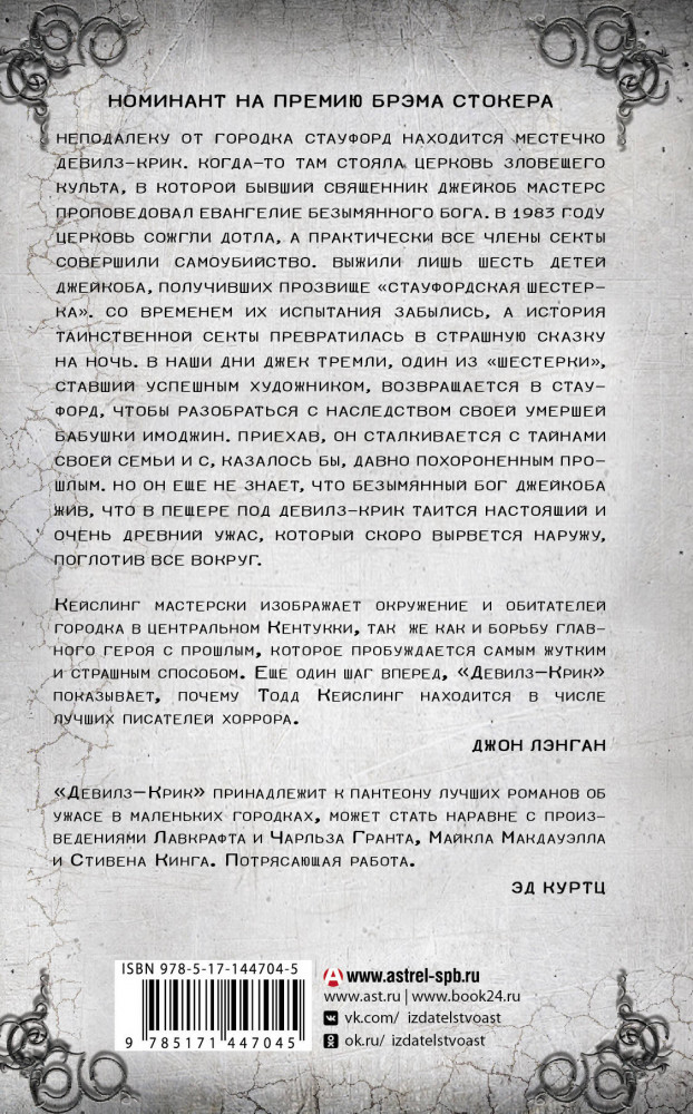 Девилз-КрикВ данный момент этот товар отсутствует в продаже. Возможно, у нас найдется аналогичный или похожий товар здесь. Серия: Мастера ужасов Неподалеку от городка Стауфорд находится местечко Девилз-Крик. Когда-то там стояла церковь зловещего культа, в которой бывший священник Джейкоб Мастерс проповедовал евангелие безымянного бога. В 1983 году церковь сожгли дотла, а практически все члены секты совершили самоубийство. Выжили лишь шесть детей Джейкоба, получивших прозвище «Стауфордская шестерка». Со временем их испытания забылись, а история таинственной секты превратилась в страшную сказку на ночь. В наши дни Джек Тремли, один из «Шестерки», ставший успешным художником, возвращается в Стауфорд, чтобы разобраться с наследством своей умершей бабушки Имоджин. Приехав, он сталкивается с тайнами своей семьи и с, казалось бы, давно похороненным прошлым. Но он еще не знает, что безымянный бог Джейкоба жив, что в пещере под Девилз-Крик таится настоящий и очень древний ужас, который скоро вырвется наружу, поглотив все вокруг. |