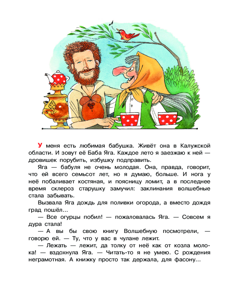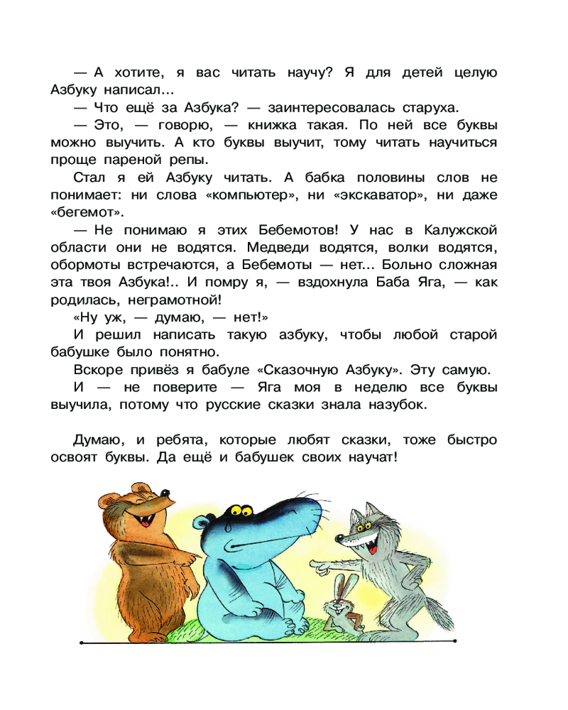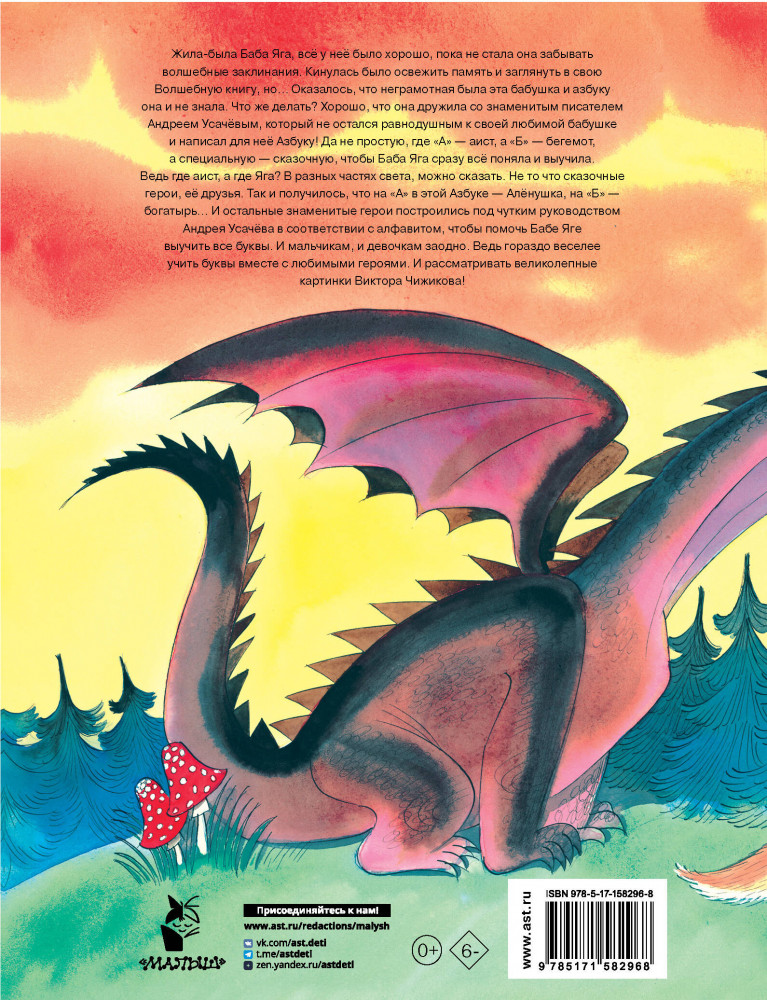 Азбука Бабы ЯгиВ данный момент этот товар отсутствует в продаже. Возможно, у нас найдется аналогичный или похожий товар здесь. Серия: Книги А. Усачёва Жила-была Баба Яга, всё у неё было хорошо, пока не стала она забывать волшебные заклинания. Кинулась было освежить память и заглянуть в свою Волшебную книгу, но... Оказалось, что неграмотная была эта бабушка и азбуку она и не знала. Что же делать? Хорошо, что она дружила со знаменитым писателем Андреем Усачёвым, который не остался равнодушным к своей любимой бабушке и написал для неё Азбуку! Да не простую, где «А» — аист, а «Б» — бегемот, а специальную — сказочную, чтобы Баба Яга сразу всё поняла и выучила. Ведь где аист, а где Яга? В разных частях света, можно сказать. Не то что сказочные герои, её друзья. Так и получилось, что на «А» в этой Азбуке — Алёнушка, на «Б» — богатырь... И остальные знаменитые герои построились под чутким руководством Андрея Усачёва в соответствии с алфавитом, чтобы помочь Бабе Яге выучить все буквы. И мальчикам, и девочкам заодно. Ведь гораздо веселее учить буквы вместе с любимыми героями. И рассматривать великолепные картинки Виктора Чижикова! |
