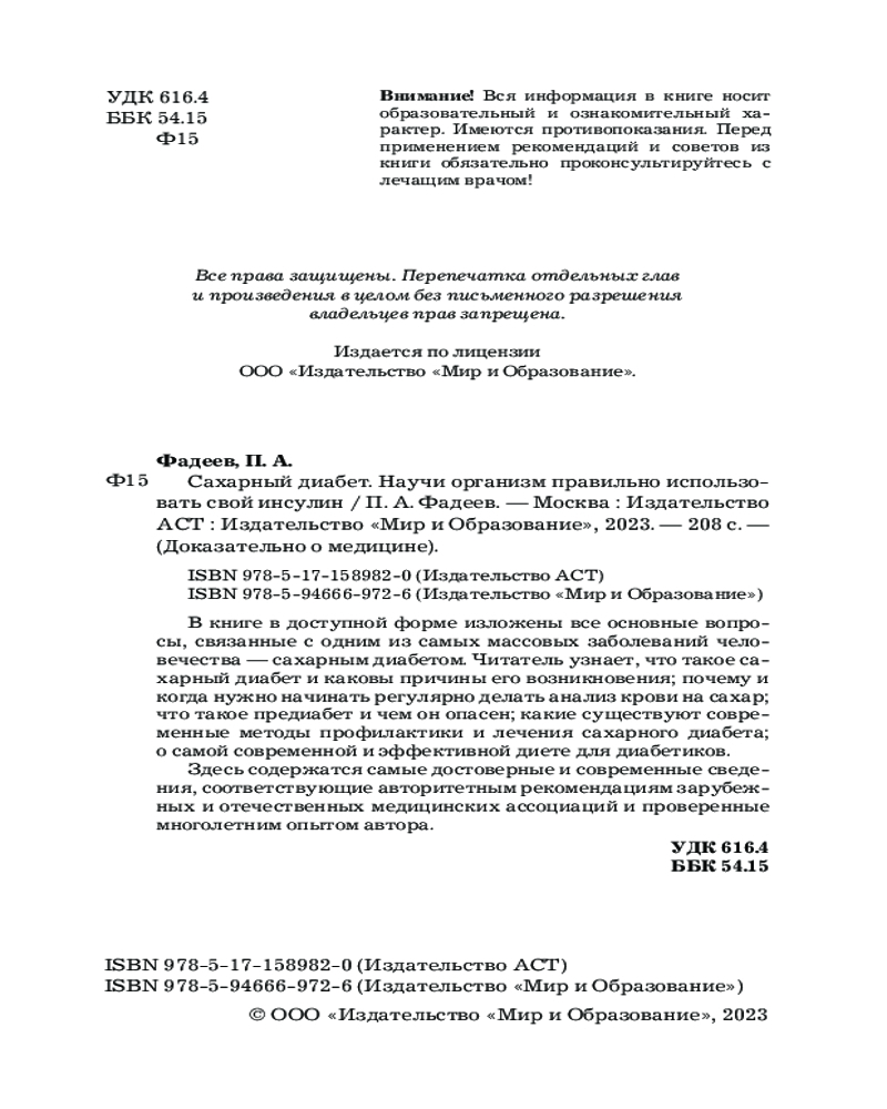 💳 Оплатить за товар можно при получении 🇰🇿 Есть бесплатная доставка по Казахстану от 1 дня 🎁 Копите бонусы с каждой покупки Серия: Доказательно о медицине Павел Александрович Фадеев — кандидат медицинских наук, врач высшей категории, заведующий отделением крупной клинической больницы. Автор более 1 500 выпусков телевизионных медицинских программ, имеет более 200 научных и популярных медицинских публикаций, член Союза журналистов. |