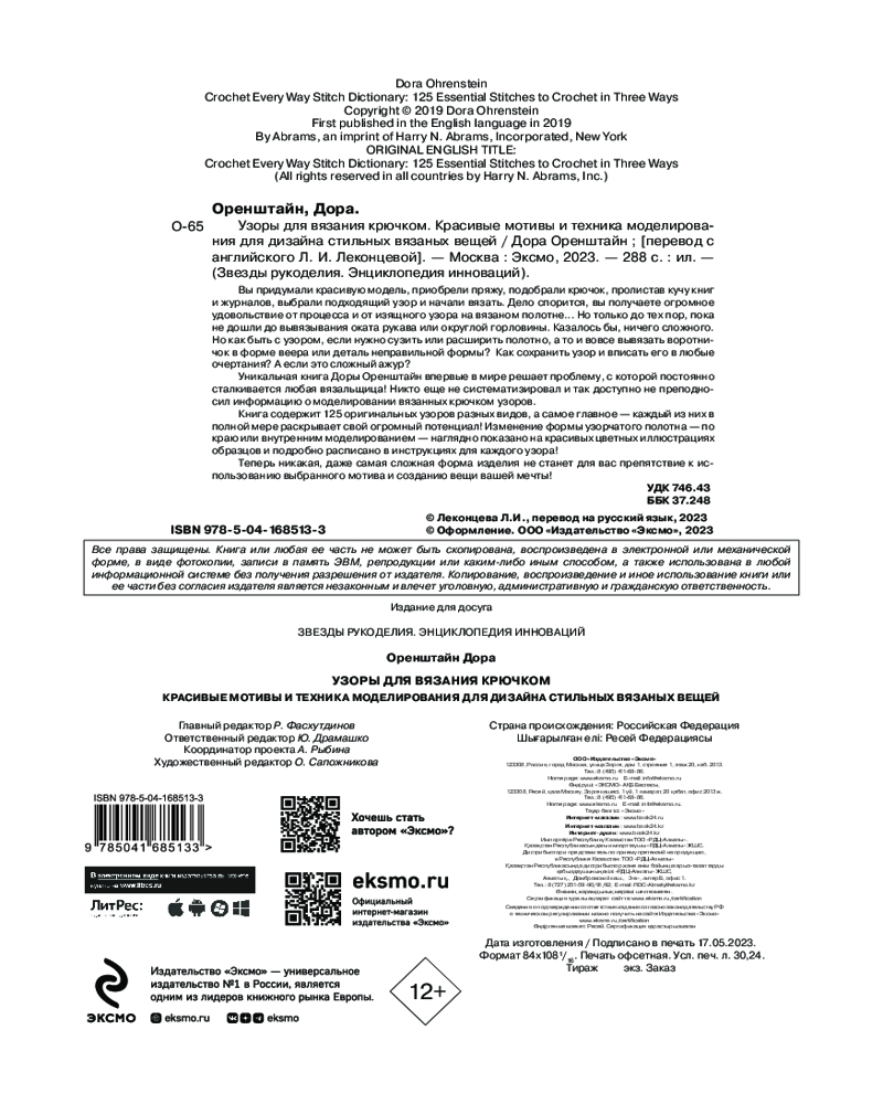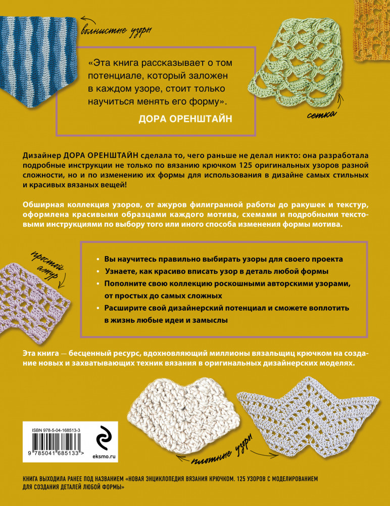 Узоры для вязания крючком. Красивые мотивы и техника моделирования для дизайна стильных вязаных вещейВ данный момент этот товар отсутствует в продаже. Возможно, у нас найдется аналогичный или похожий товар здесь. Серия: Звезды рукоделия. Энциклопедия инноваций Уникальная энциклопедия для всех увлеченных вязанием крючком! Знаменитый автор впервые представляет не просто сборник оригинальных узоров, а удобную систематизированную и понятно изложенную технологию их моделирования для создания деталей абсолютно любой формы без искажения мотива на вязаном полотне. Такого материала нет ни в одной книге мира! Вечная проблема вязальщиц — как связать сложный воротничок или вписать узор в окат рукава — решена раз и навсегда. |