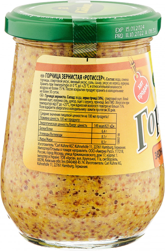 Зернистая горчица, также известная многим как «rotisseur» (Full Grain/цельнозерновая горчица) — это пряная горчица грубого помола. Большая часть горчичных зерен остается целыми, поэтому горчица не теряет аромата при нагревании. Это делает ее любимым сортом горчицы для приготовления горячей пищи, а также классическим ингредиентом маринадов для гриля и барбекю. |