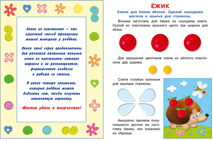 💳 Оплатить за товар можно при получении 🇰🇿 Есть бесплатная доставка по Казахстану от 1 дня 🎁 Копите бонусы с каждой покупки Серия: Аппликация из пластилина Лепка из пластилина — это отличный способ тренировки мелкой моторики у ребенка. Книги этой серии предназначены для развития начальных навыков лепки из пластилина: катание шариков и их расплющивание, формирование колбасок и работа со стеком. В каждой книге серии четыре заготовки, которые ребенок может доделать сам, чтобы получить законченную картинку. Желаем удачи в творчестве! |