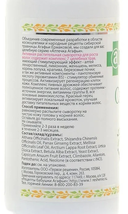 💳 Оплатить за товар можно при получении 🇰🇿 Есть бесплатная доставка по Казахстану от 1 дня 🎁 Копите бонусы с каждой покупки Серия: Аптечка Агафьи Активная растительная сыворотка для роста волос содержит в своем составе комплекс 7 целебных трав, имеющий стимулирующий эффект — алтей лекарственный, лимонник, женьшень, мелисса, корень лопуха, крапива, березовые поч-ки; а также активные компоненты — пантотеновая кислота (провитамин В5), комплекс пивных дрожжей, вытяжка красного перца, климбазол. |