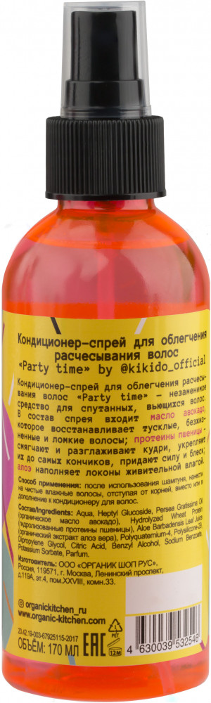 Organic Kitchen Кондиционер-спрей для облегчения расчесывания волос «Party time by Kikido»В данный момент этот товар отсутствует в продаже. Возможно, у нас найдется аналогичный или похожий товар здесь. Серия: Блогеры Кондиционер-спрей для облегчения расчесывания волос «Party time» — незаменимое средство для спутанных, вьющихся волос. В состав спрея входит масло авокадо, которое восстанавливает тусклые, безжизненные и ломкие волосы; протеины пшеницы — смягчают и разглаживают кудри, укрепляют их до самых кончиков, придают силу и блеск; алоэ наполняет локоны живительной влагой. |