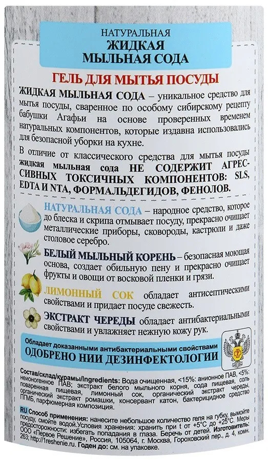 Рецепты Бабушки Агафьи Сода жидкая для мытья посудыВ данный момент этот товар отсутствует в продаже. Возможно, у нас найдется аналогичный или похожий товар здесь. Жидкая мыльная сода — уникальное средство для мытья посуды, сваренное по особому сибирскому рецепту бабушки Агафьи, на основе проверенных временем натуральных компонентов, которые издавна использовались для безопасной уборки на кухне. Жидкая мыльная сода не содержит агрессивных токсичных компонентов, SLS, EDTA и NTA, формальдегидов, фенолов, поэтому абсолютно безопасна. Мыльная сода отлично справляется с загрязнениями, удаляет жир и хорошо смывается с посуды. Подходит для чистки любых кухонных поверхностей. |