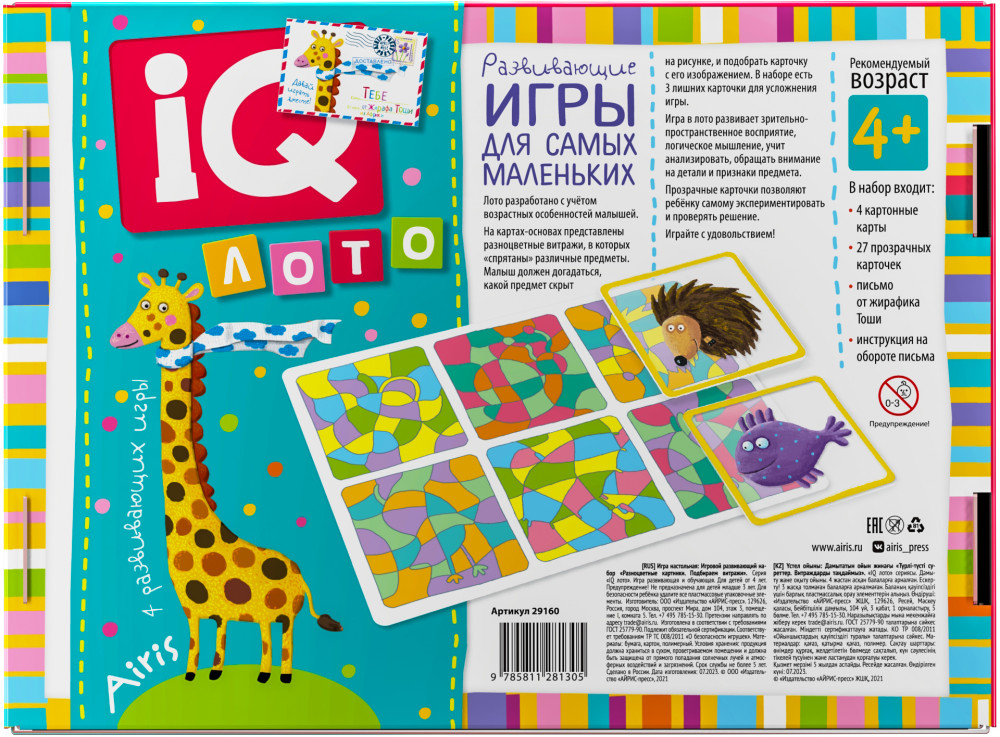 💳 Оплатить за товар можно при получении 🇰🇿 Есть бесплатная доставка по Казахстану от 1 дня 🎁 Копите бонусы с каждой покупки Серия: IQ Лото На картах-основах представлены разноцветные витражи, в которых «спрятаны» различные предметы. Малыш должен догадаться, какой предмет скрыт на рисунке, и подобрать карточку с его изображением. |