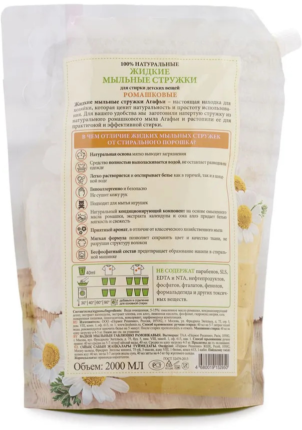 Рецепты Бабушки Агафьи Стружки жидкие мыльные «Ромашковые»В данный момент этот товар отсутствует в продаже. Возможно, у нас найдется аналогичный или похожий товар здесь. Это настоящая находка для хозяйки, которая ценит натуральность и простоту использования. Для вашего удобства мы заготовили натертую мыльную стружку и растопили ее для практичной и эффективной стирки. Мыльные стружки изготовлены из свежесваренного мыла Агафьи на основе натуральных омыленных масел кедра, горчицы и ромашки с добавлением отваров сибирских трав. Благодаря чему жидкие мыльные стружки на 100% безопасны, экологичны и натуральны. Жидкие мыльные стружки не содержат парабенов, SLS, EDTA и NTA, нефтепродуктов, фосфатов, фталатов, фенолов, формальдегида и других токсичных веществ. |