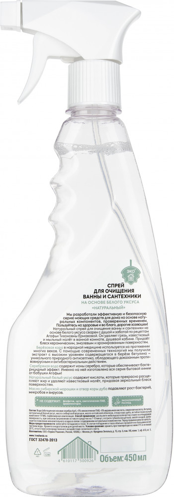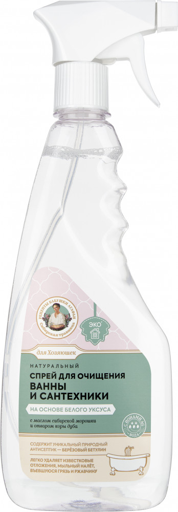 Рецепты Бабушки Агафьи Спрей для чистки ванны и сантехники на основе белого уксусаВ данный момент этот товар отсутствует в продаже. Возможно, у нас найдется аналогичный или похожий товар здесь. Натуральный спрей для очищения ванны и сантехники на основе белого уксуса сварен с душой и заботой по рецептам Агафьи Тихоновны Ермаковой. Он удаляет грязь, известковый и мыльный налёт в ванной комнате, душевой кабине. Придаёт блеск керамическим, эмалевым, и хромированным поверхностям. Берёзовая кора в народной медицине используется на протяжении многих веков. С помощью современных технологий мы получили экстракт с высоким уровнем содержащегося в берёзе бетулина — уникального природного антисептика, обладающего доказанным противовирусным и антибактериальным действием. |
