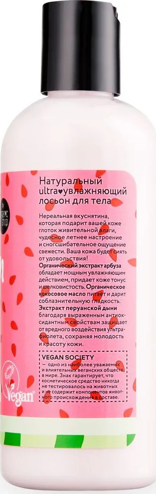 Organic Shop Лосьон для тела увлажняющий «What-a-melon»В данный момент этот товар отсутствует в продаже. Возможно, у нас найдется аналогичный или похожий товар здесь. Серия: Summer edition Нереальная вкуснятина, которая подарит вашей коже глоток живительной влаги, чудесное летнее настроение и сногсшибательное ощущение свежести. Ваша кожа будет сиять от удовольствия! Органический экстракт арбуза обладает мощным увлажняющим действием, придает коже тонус и шелковистость. Органическое кокосовое масло питает и дарит соблазнительную гладкость. Экстракт перуанской дыни благодаря выраженным антиоксидантным свойствам защищает от вредного воздействия ультрафиолета, сохраняя молодость и красоту кожи. |
